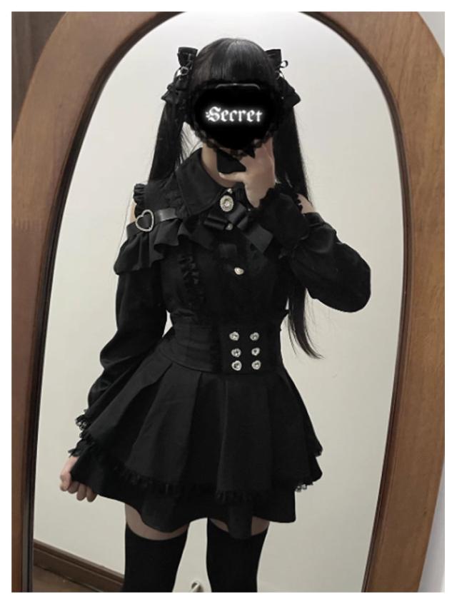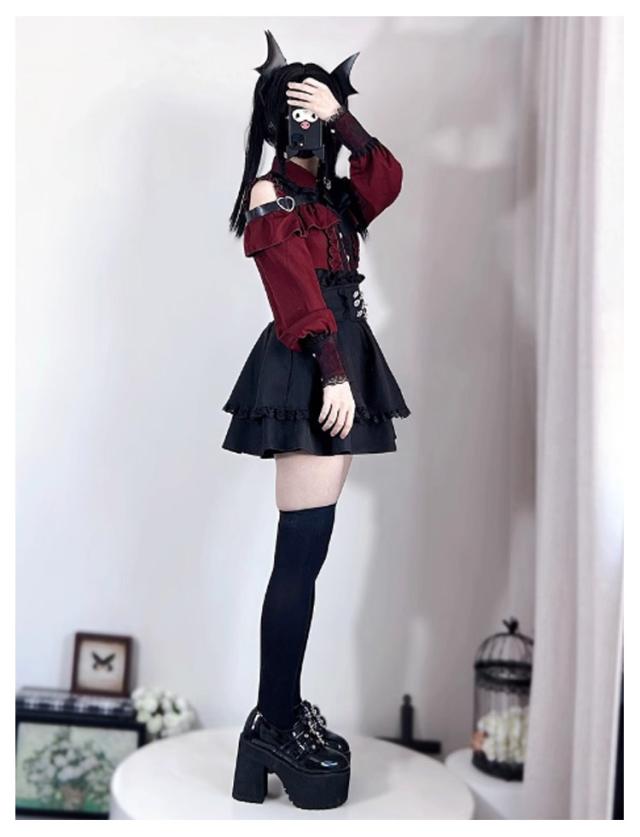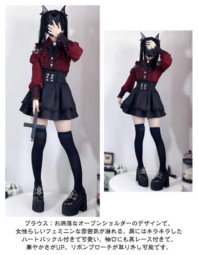| 長袖トップス+ミニスカートのセットアップ。【黒?水色?赤】【S-XL】 ブラウス:お洒落なオープンショルダーのデザインで、女性らしいフェミニンな雰囲気が溢れる。肩にはキラキラしたハートバックル付きで可愛い。袖口にも黒レース付きで、華やかさがUP。リボンブローチが取り外し可能です。 ミニスカート:ウエストに付いている飾り用ハートボタンがポイント。Aライン&ハイウエストのスカートは着痩せ・高見え効果が抜群。ウエストにはゴム付きです。(インナーパンツなしです) 幅広く活躍:量産型、地雷系、ガーリー系、ロリータ系コーデにおすすめです。女子会、デートなど様々なシーンで幅広く活躍中。お洒落で可愛いデザインで、プレゼントとしてもピッタリです。 | |