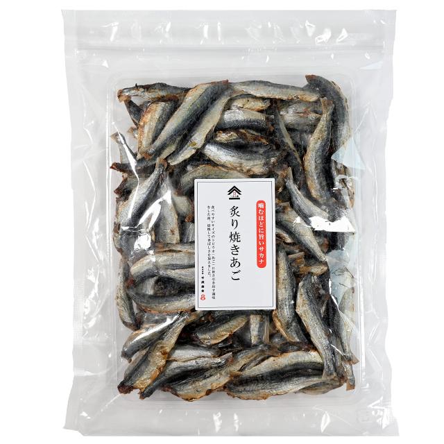 【小魚(あご)の炙り焼き】煮干し(いりこ)に比べ深い旨味で、高級出汁にもなるトビウオ(あご)。一匹一匹を炙り焼きで噛むほどに深い味わいを楽しむ一品に仕上げました。旨味を引き出す甘めの調味で、ししゃもなどの干物(ひもの)がわりに、おつまみ・おやつにちょっとした贅沢が味わえる一品です。