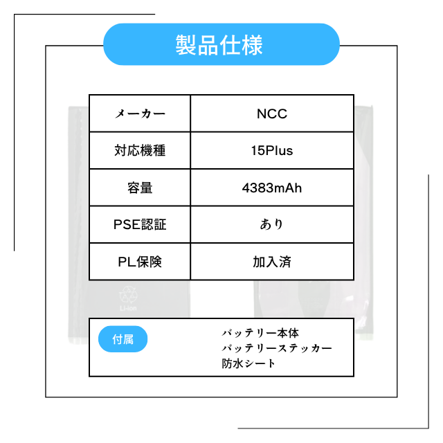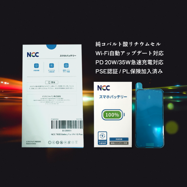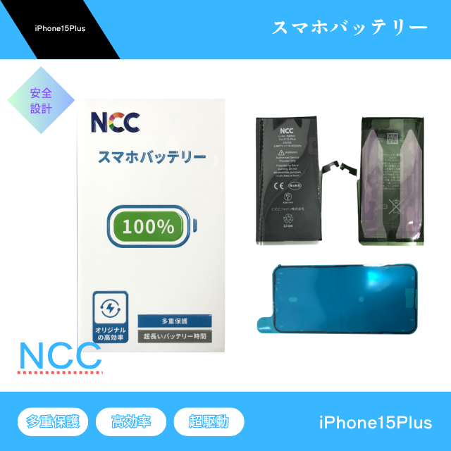 iPhone15Plus バッテリー NCC Prime 交換 純正同等 バッテリー 防水シート バッテリーステッカー PSE取得