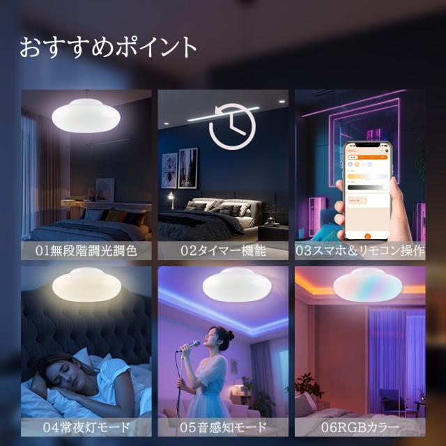 本製品は無段階調光&調色機能を搭載し、気分や季節によって、部屋の光量や背景色を一変!全方位制御できる便利なリモコンが付きます。また、指定のアプリをダウンロードして、スマホでも自由に操作可能です。常夜灯は夜間授乳や病人の看護に最適です。3%の明るさで照明してくれて、目に優しくて節電です。