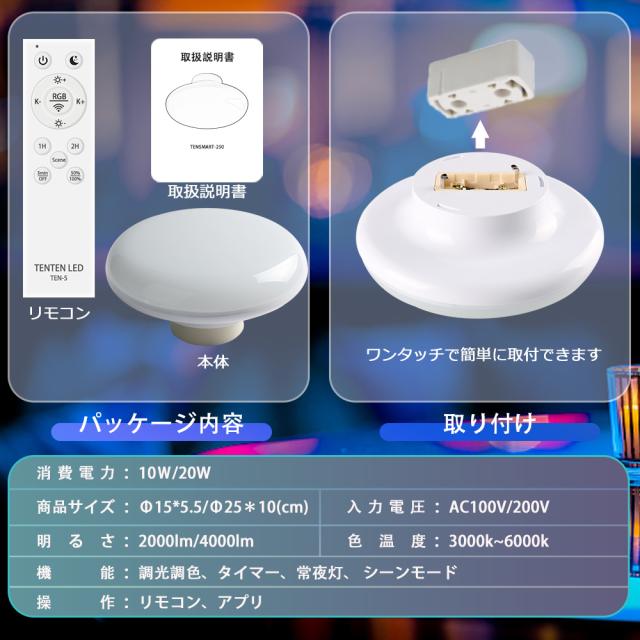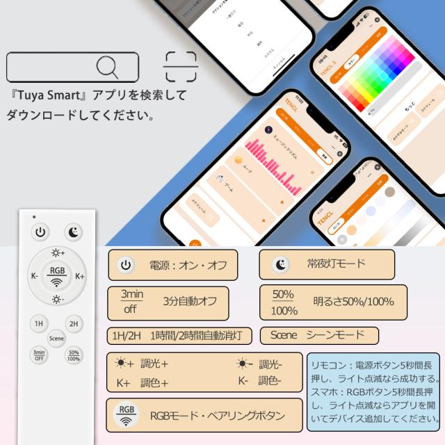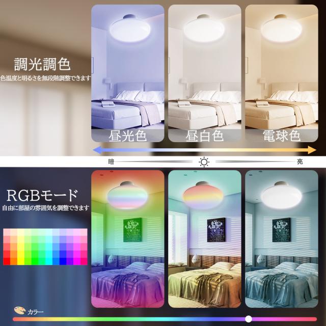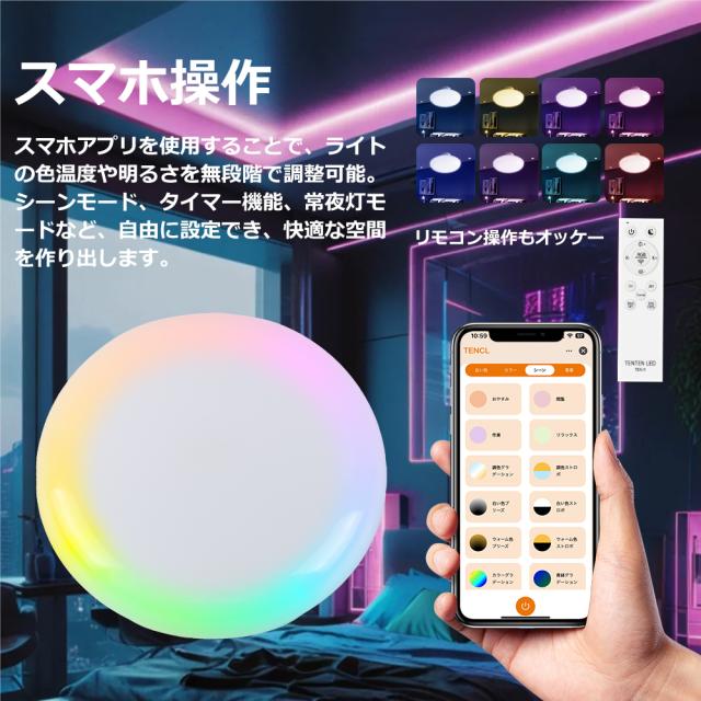 - 本製品は無段階調光&調色機能を搭載し、気分や季節によって、部屋の光量や背景色を一変!全方位制御できる便利なリモコンが付きます。また、指定のアプリをダウンロードして、スマホでも自由に操作可能です。常夜灯は夜間授乳や病人の看護に最適です。3%の明るさで照明してくれて、目に優しくて節電です。
