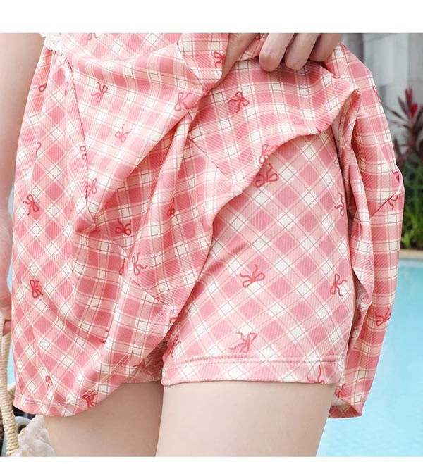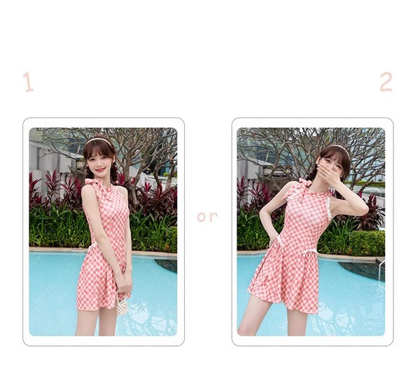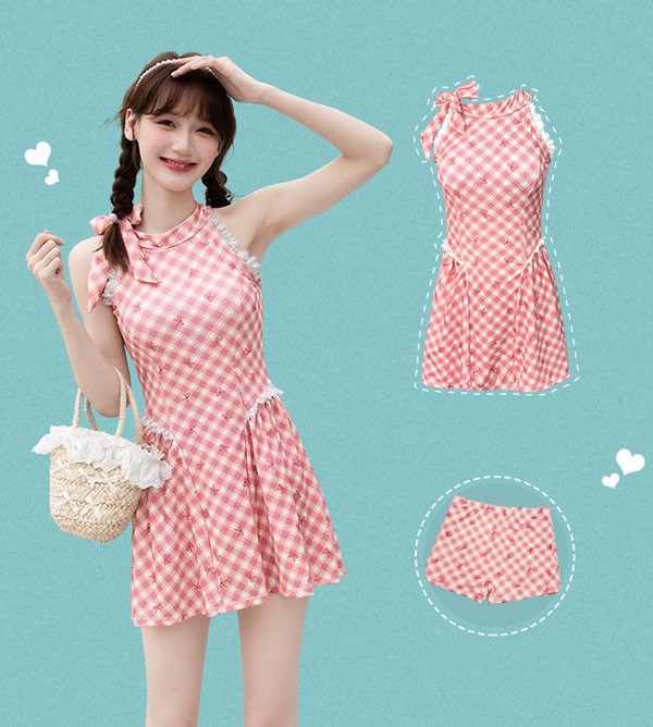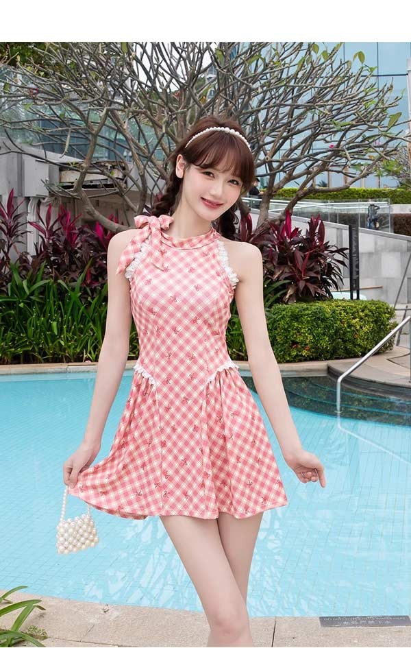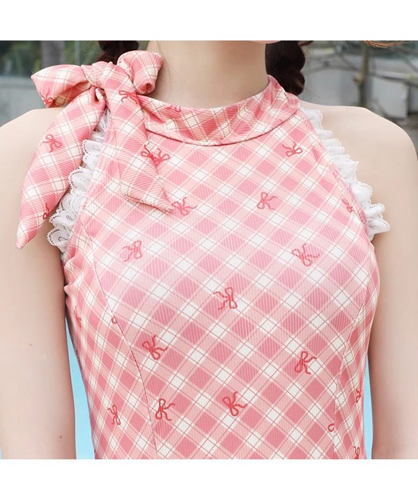 ワンピース水着 ホルターネック チェック柄 服みたいな リボン フリル 水着 レディース ノースリーブ ワイヤーなし パッド付 着痩せ シンプル セクシー 写真映え 撮影用 海 夏 サマー プール リゾート かわいい 旅行 温泉 大人 女性用 ジュニア 学生 女の子 ピンク M L XL 2XL mg870m4m4ld