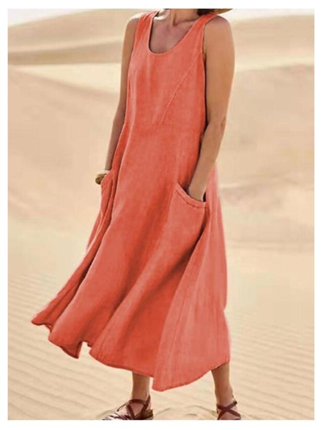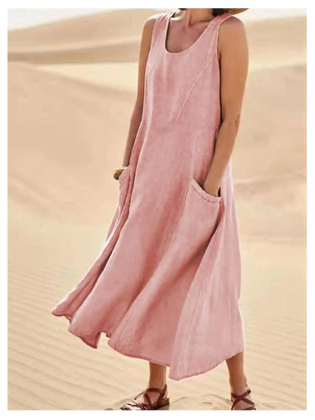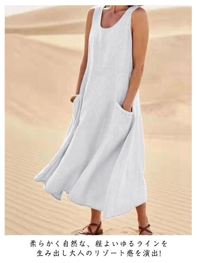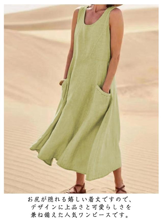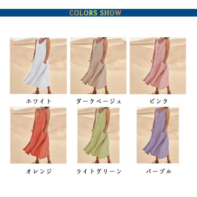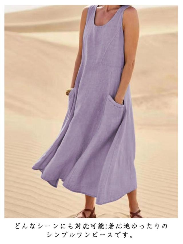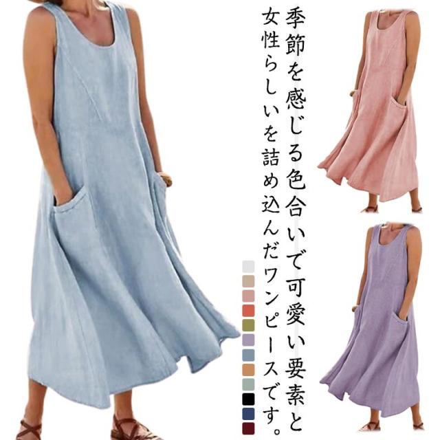 ワンピース 綿麻風 ワンピース レディース ノースリーブ ワンピース ミモレワンピース 大きいサイズ 春夏 ゆったり ロングワンピース ナチュラル 袖なしワンピース 無地 カジュアル おしゃれ