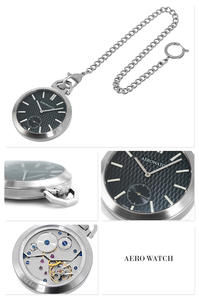 正規品 アエロウォッチ 数量限定 スイス製 メンズ レディース 懐中時計 50829-AA05 AEROWATCH アナログ ブラック 黒 ◆AEROWATCH(アエロウォッチ)は、代々一流の時計職人であったクレヴァジェ家の時術と伝統を引き継いだマキシム・クレヴァジェ氏によって1910年スイスのニューシャテル市に設立。1959年には世界最大の時計と宝飾の見本市であるバーゼルフェアへも参加し、本格的な腕時計メーカーの仲間入りを果たしています。現在は、スイスでは数少ない高級ポケットウォッチの専門メーカーとして活躍。歴史と伝統に裏づけされた確かな技術と、魅力的なデザインが融合して生み出されたコレクションは、近年さらに世界の時計愛好家の注目を集めています。 スモールセコンド機能が付いた手巻き式懐中時計。裏面はスケルトン仕様になっています。 機械式時計