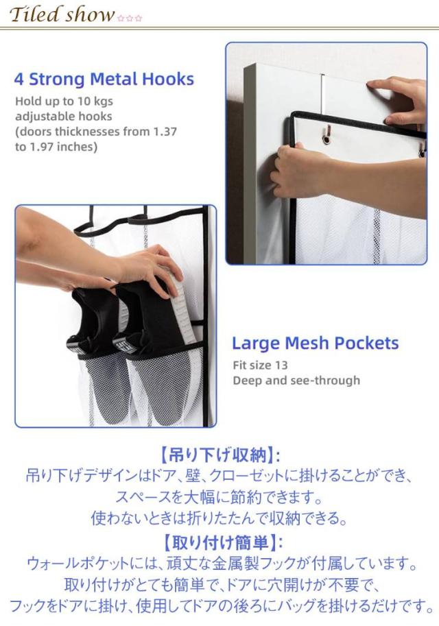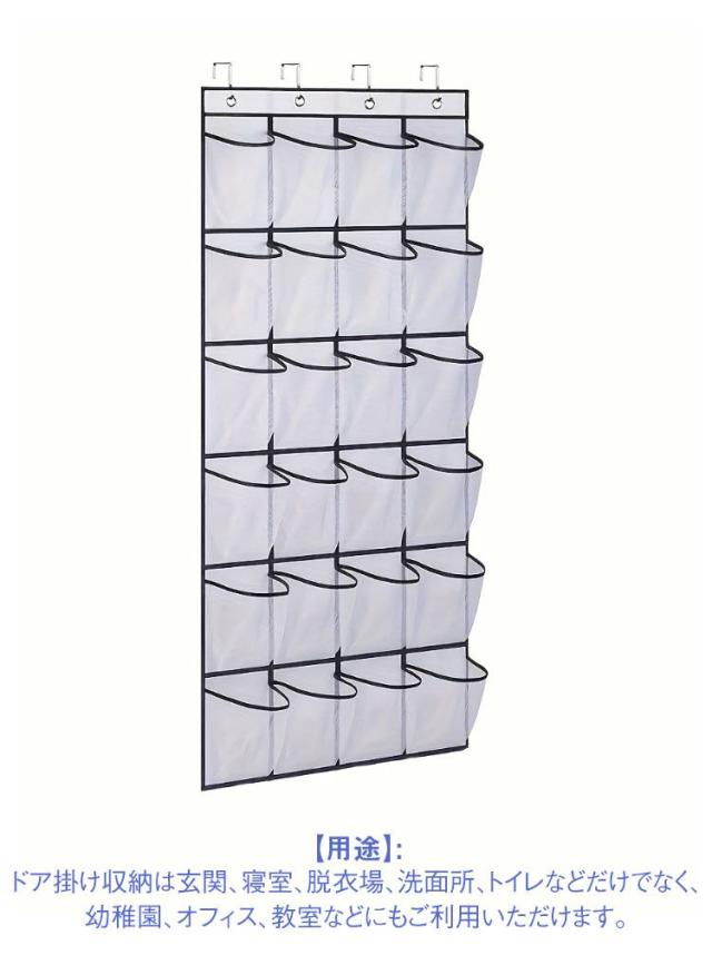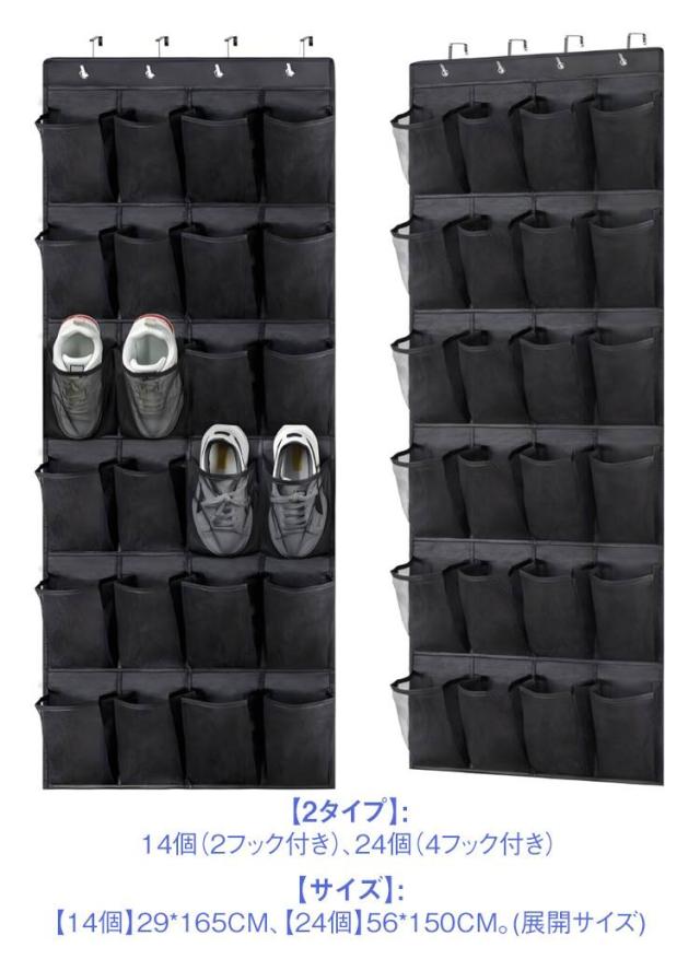 | 【2タイプ】:14個(2フック付き)、24個(4フック付き) 【サイズ】:【14個】29*165cm、【24個】56*150cm。(展開サイズ) 【素材】:耐久性のある不織布で作られており、通気性に優れたメッシュ生地製ポケット、壁に取り付けられたウォールバッグの強力な収納機能をお楽しみいただけます。 【吊り下げ収納】:吊り下げデザインはドア、壁、クローゼットに掛けることができ、スペースを大幅に節約できます。使わないときは折りたたんで収納できる。 【取り付け簡単】:ウォールポケットには、頑丈な金属製フックが付属しています。取り付けがとても簡単で、ドアに穴開けが不要で、フックをドアに掛け、使用してドアの後ろにバッグを掛けるだけです。 【用途】:ドア掛け収納は玄関、寝室、脱衣場、洗面所、トイレなどだけでなく、幼稚園、オフィス、教室などにもご利用いただけます。 | |