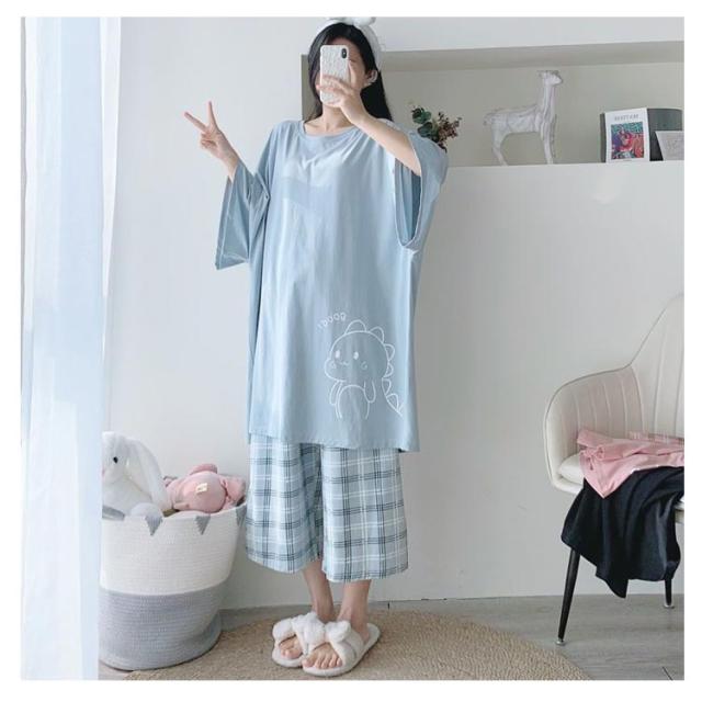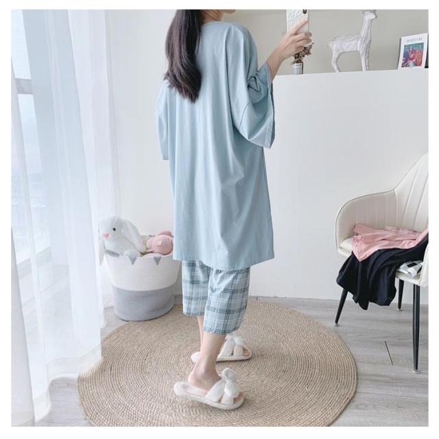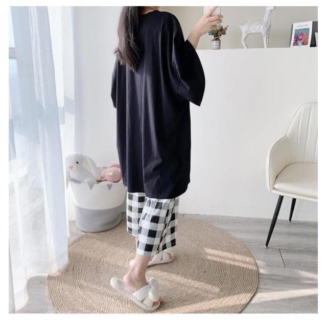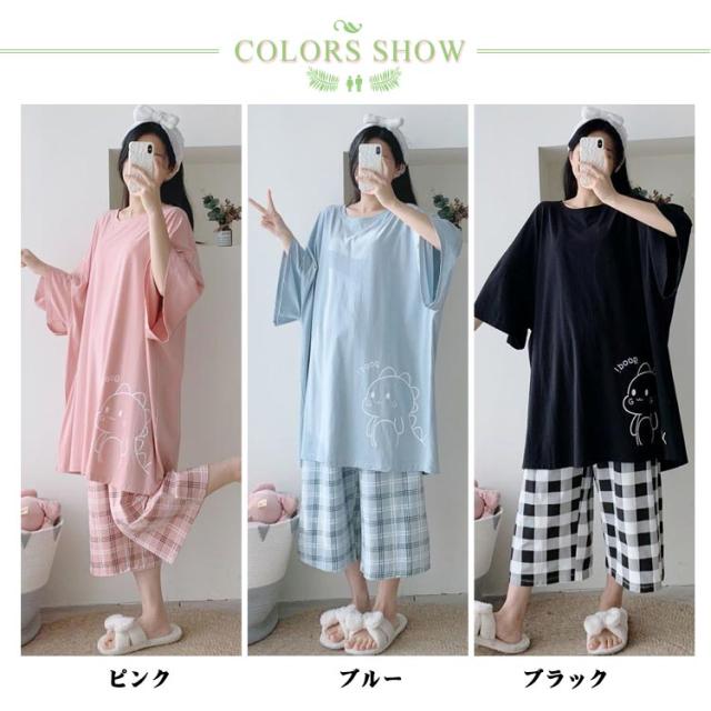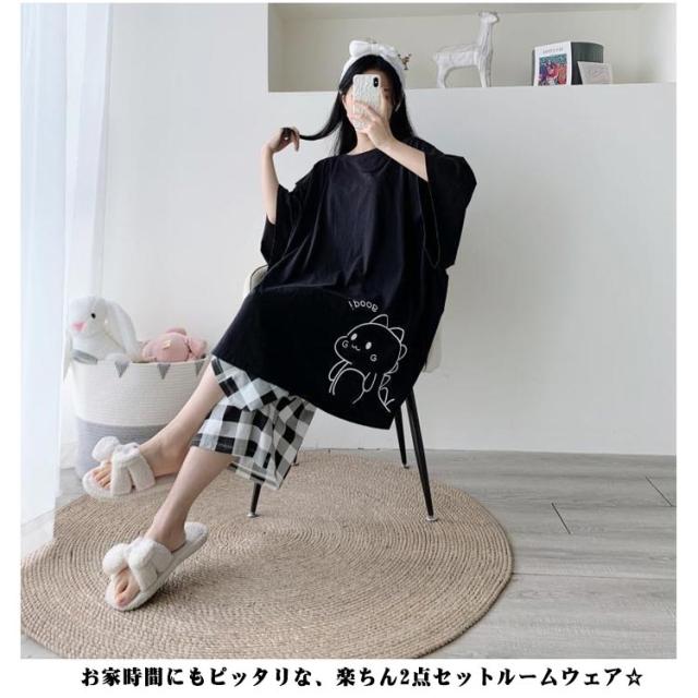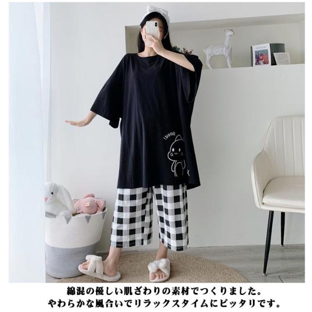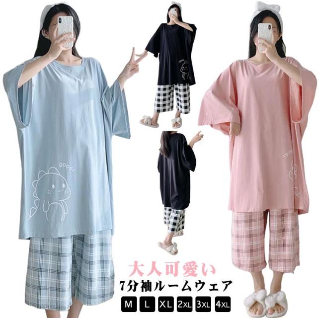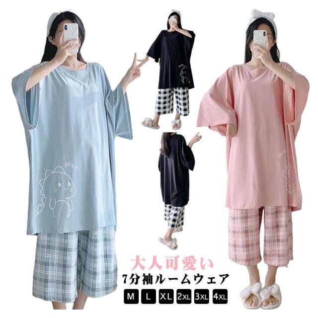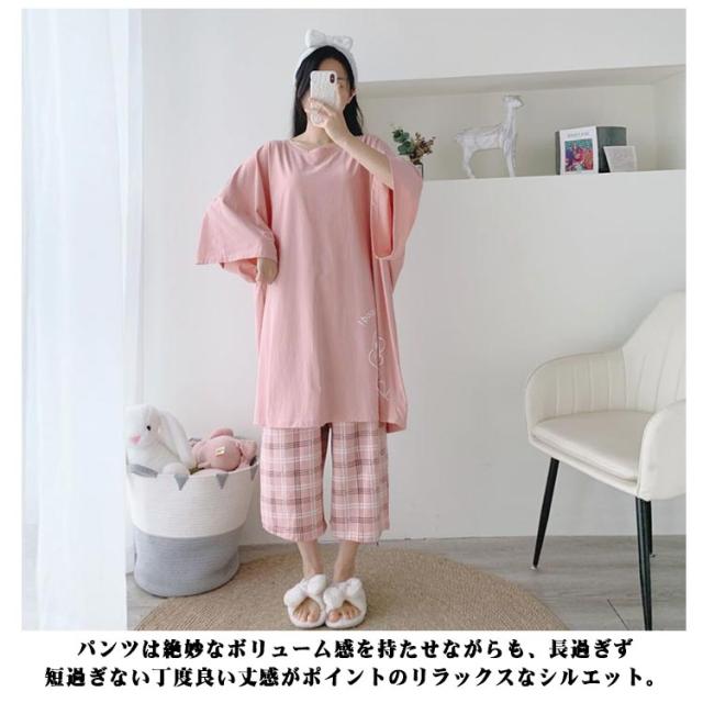 カットソー プルオーバー レディース 上下セット ワイドパンツ ルームウェア 部屋着 学生 7分袖 7分丈 プレゼント 大きいサイズ オーバーサイズ 2点セット パンツ チェック柄 パジャマ tシャツ ビッグシルエット 大人 かわいい 可愛い リラックスウエア ギフト