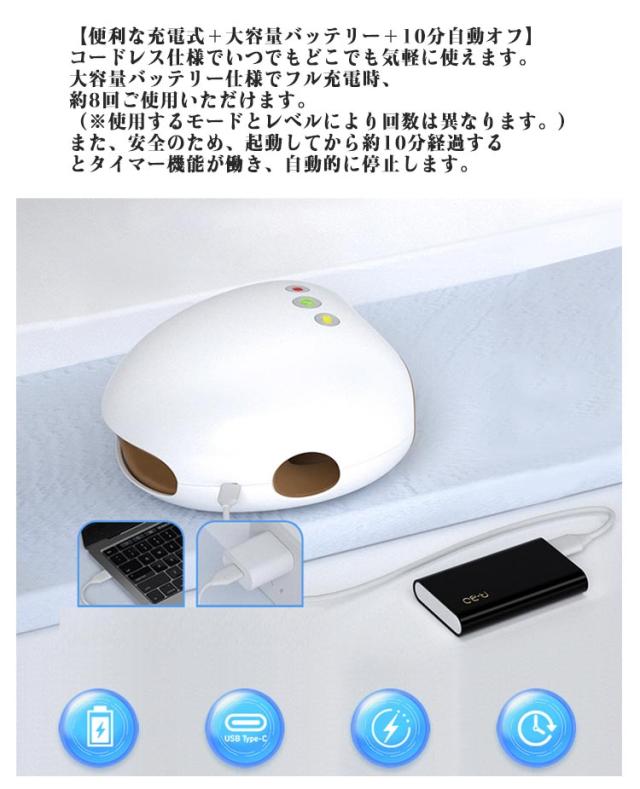 | サイズについての説明 | 本体サイズ:約187x196x111mm 消費電力:12W(ヒーター5W) 温熱温度: 約42℃/45℃/50℃ 素材: 表側/ABS樹脂、内側(抗菌)/ナイロン、ポリウレタン 電圧/電流:3.7V/1A ケアタイマー: 約10分自動OFF 内蔵バッテリ容量:2200mAh 付属品:USBケーブル 本体重量:約712g 医療用マッサージ器ではありません。 |