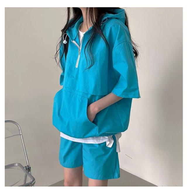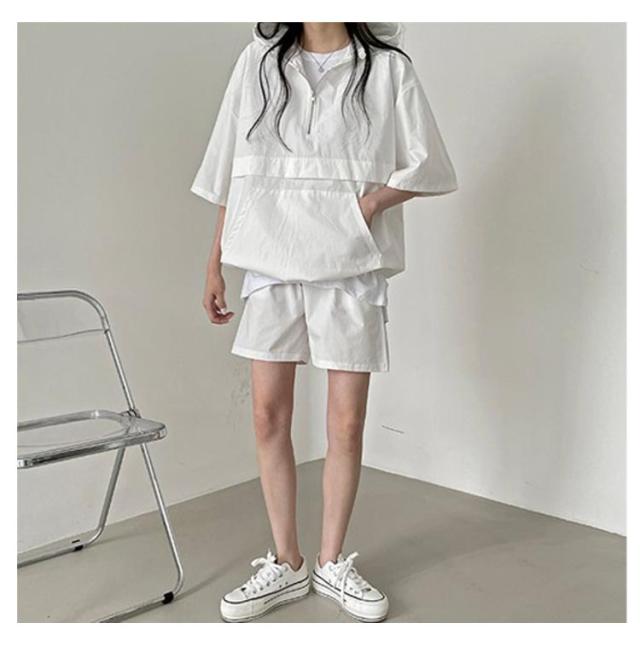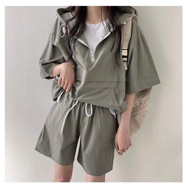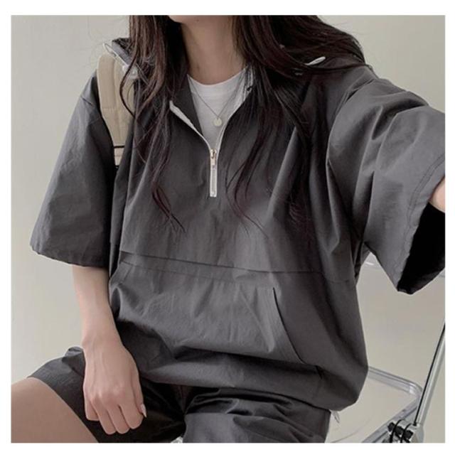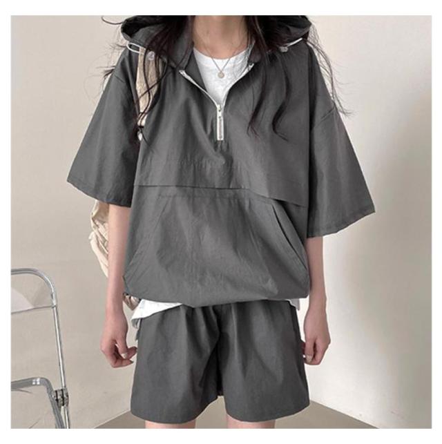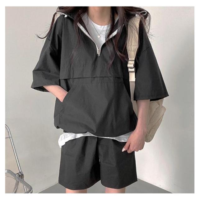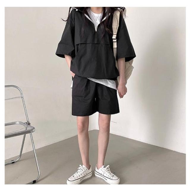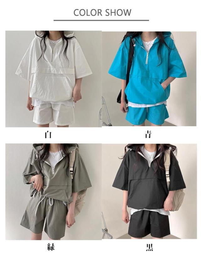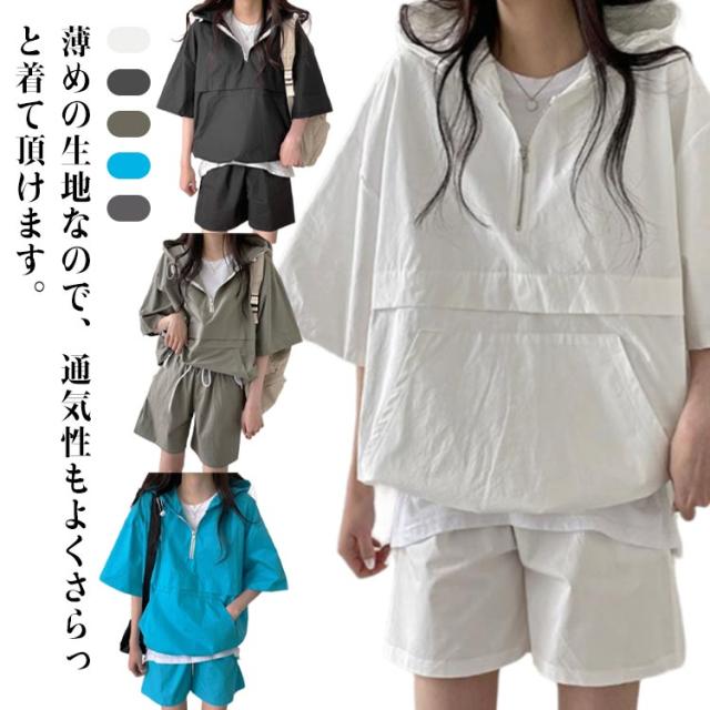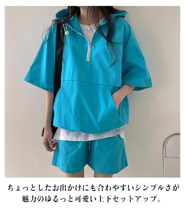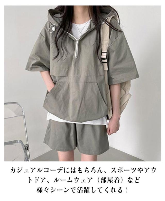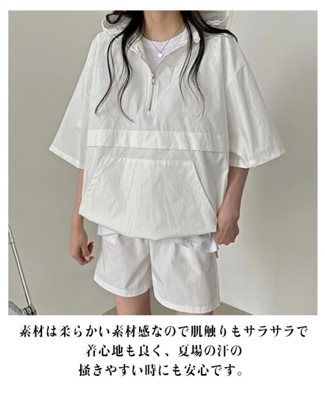 無地 ショートパンツ パンツ レディース 夏 大人 半袖 トップス 部屋着 上下セットアップ フード付き ジャージ ゆったり 運動服 ウエストゴム 白 短パン 体型カバー 可愛い 楽ちん アクティブウェア 通勤 ハーフジップ パーカー 黒