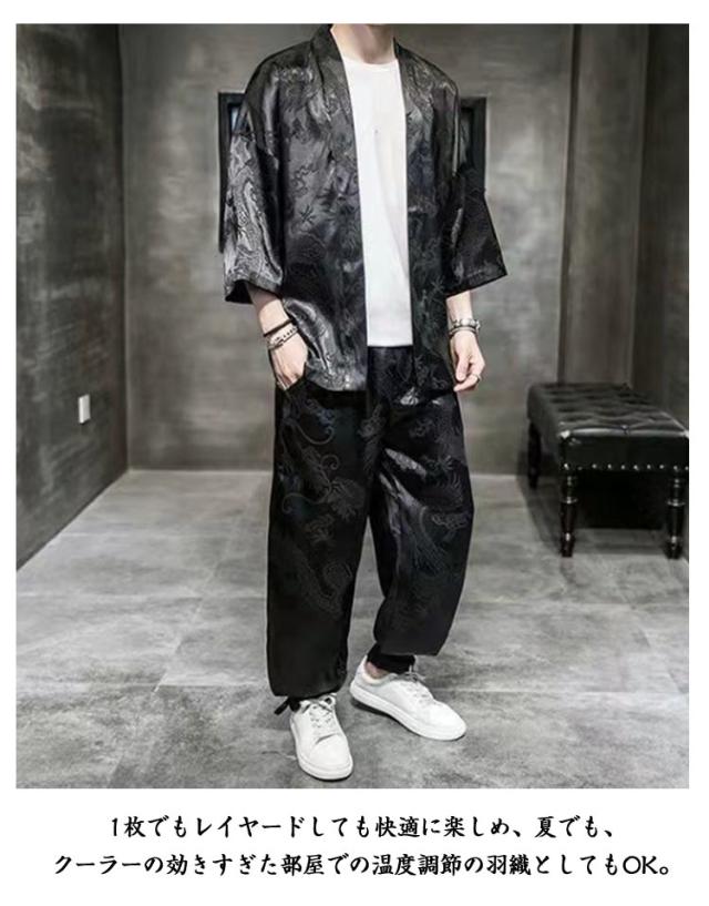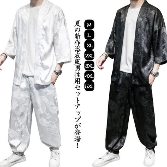 甚平 サマーウエア カジュアルウェア 羽織 メンズ おしゃれ カジュアルセットアップ 薄手 涼しい カジュアルセットアップ ロングパンツ 夏用 セットアップ 夏 大きいサイズ 龍柄 オシャレ 夏服 部屋着 浴衣 和風 上下セット 7分袖 祭り ゆったり