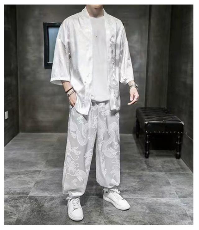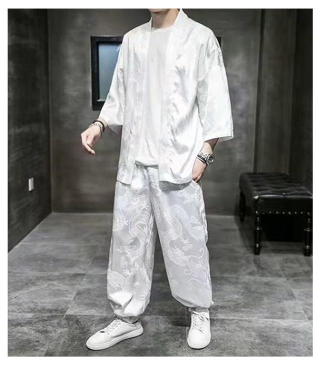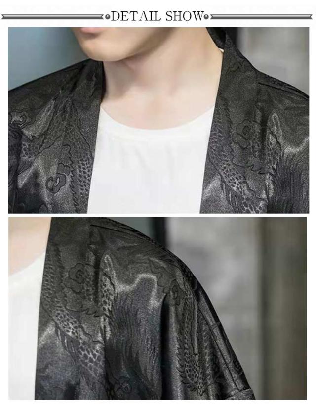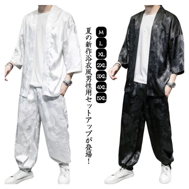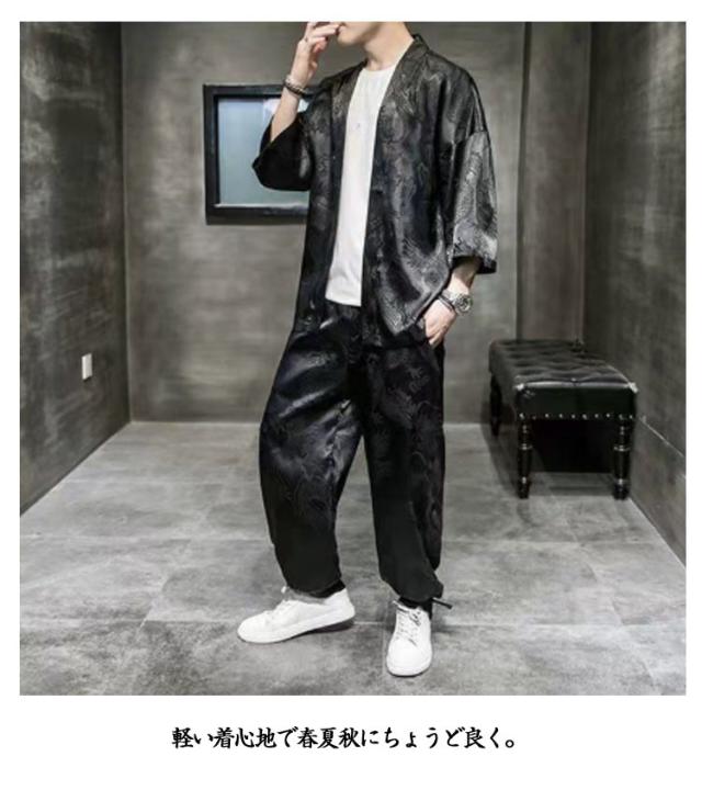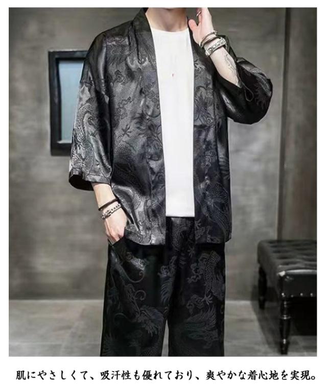 | 夏の新作浴衣風男性用セットアップが登場! 軽い着心地で春夏秋にちょうど良く。 1枚でもレイヤードしても快適に楽しめ、夏でも、クーラーの効きすぎた部屋での温度調節の羽織としてもOK。 肌にやさしくて、吸汗性も優れており、爽やかな着心地を実現。 トレンドの龍柄で個性的で独特なセンス感が出て、お洒落な雰囲気もかけ持つ。 父の日、敬老の日のプレゼントとしてもおススメです。 | |