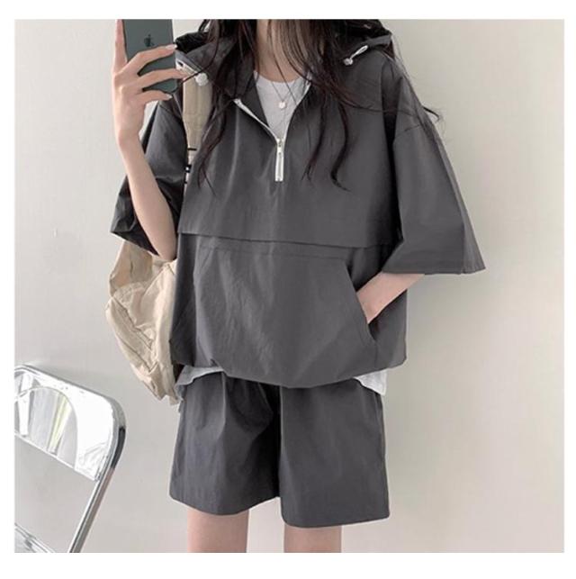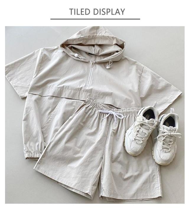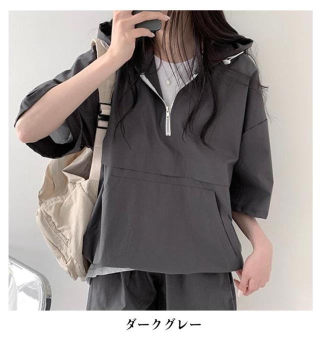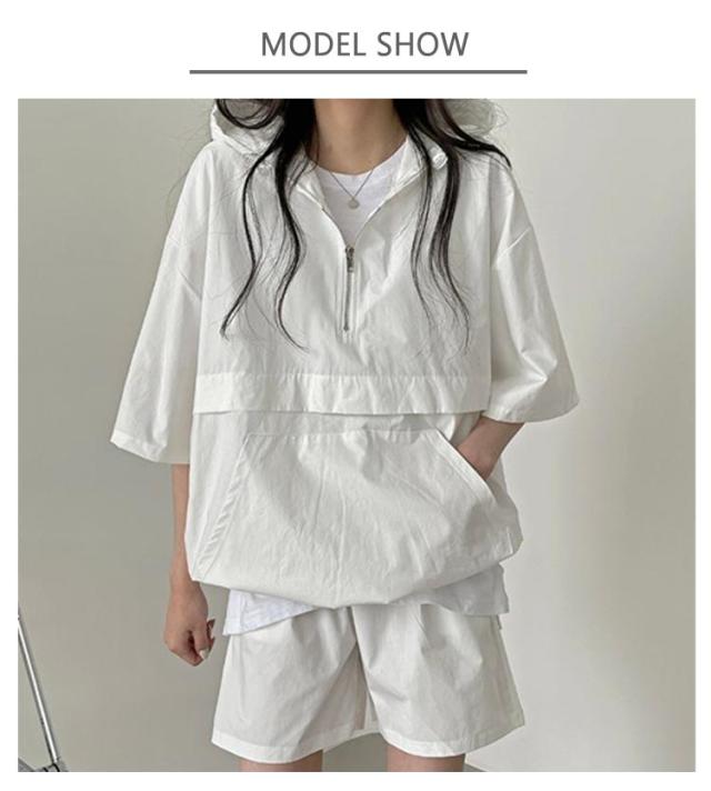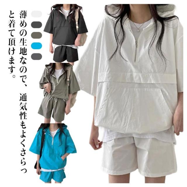 レディース 上下セットアップ パンツ パーカー 夏 ジャージ 短パン ゆったり ハーフジップ トップス 半袖 無地 ウエストゴム フード付き 大人 運動服 部屋着 体型カバー 可愛い 楽ちん アクティブウェア 通勤 パーカー 白 黒