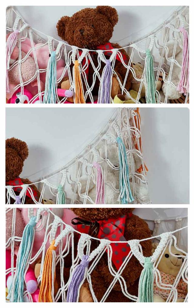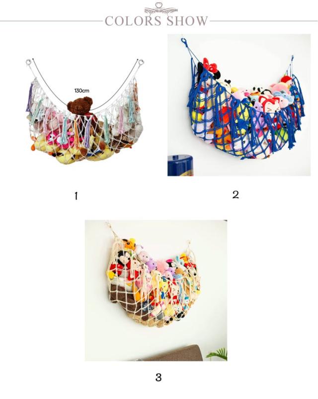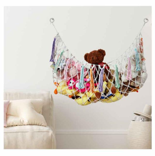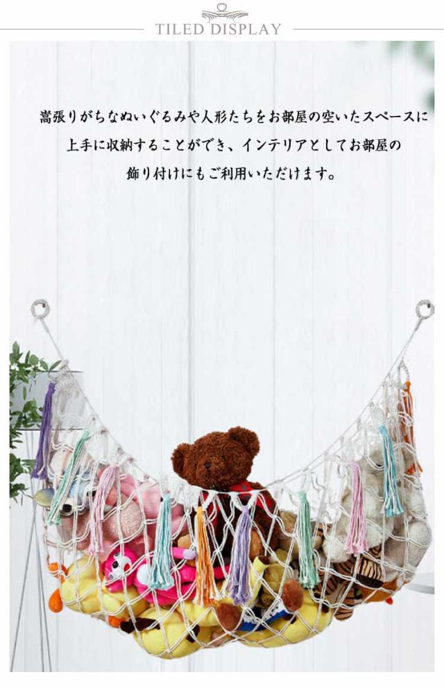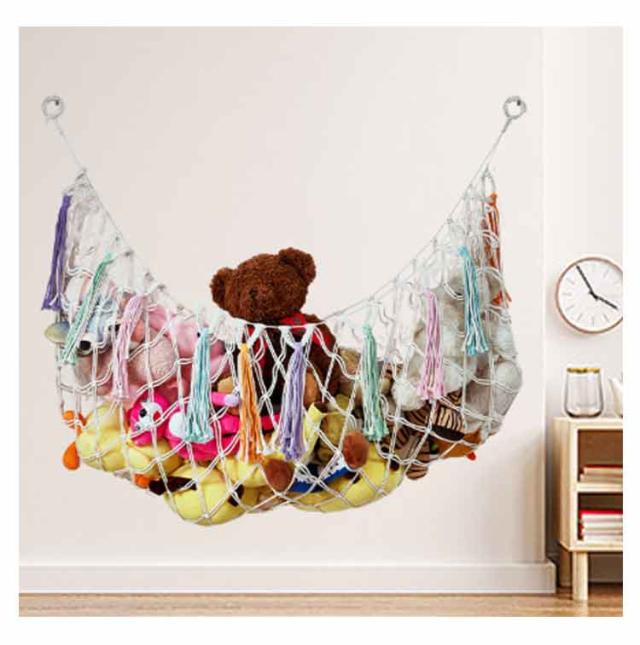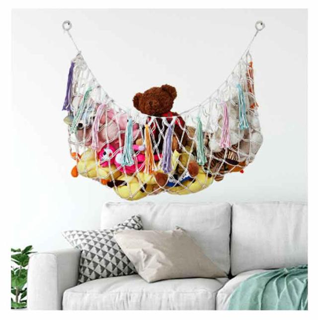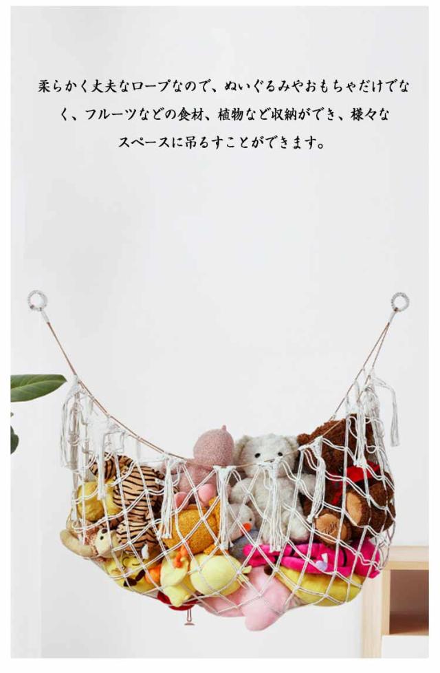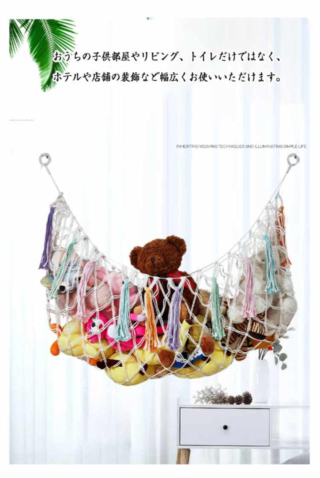 | 吊り下げ式のぬいぐるみ収納ハンモックです。 嵩張りがちなぬいぐるみや人形たちをお部屋の空いたスペースに上手に収納することができ、インテリアとしてお部屋の飾り付けにもご利用いただけます。 柔らかく丈夫なロープなので、ぬいぐるみやおもちゃだけでなく、フルーツなどの食材、植物など収納ができ、様々なスペースに吊るすことができます。 おうちの子供部屋やリビング、トイレだけではなく、ホテルや店舗の装飾など幅広くお使いいただけます。 | |