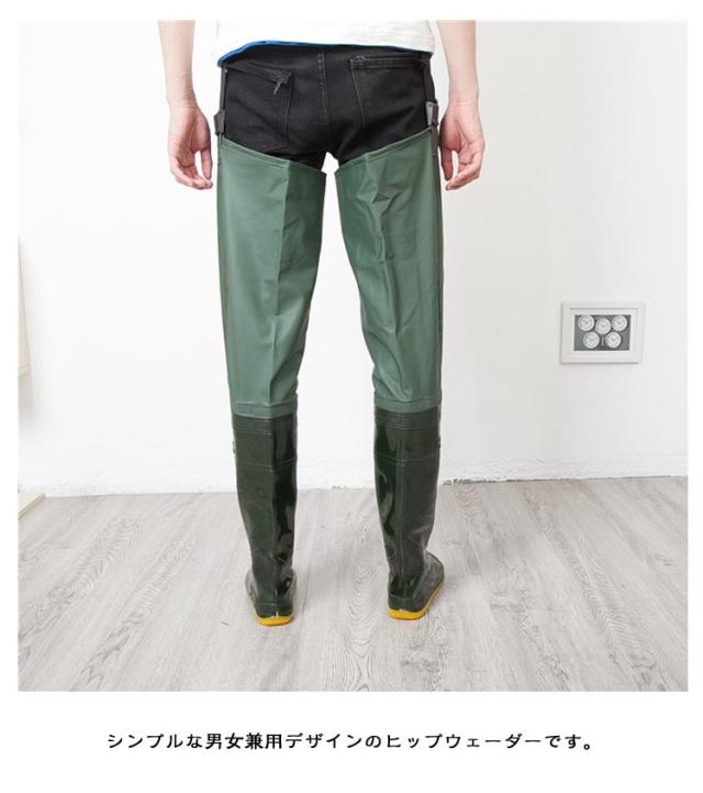 | 【ヒップウェーダー】【男女兼用】 股下まである超ロングタイプ! ずり落ち防止のバンド付き♪ シンプルな男女兼用デザインのヒップウェーダーです。 ブーツとズボンは縫い合わせるのではなく、一体化でつくられており、水漏れはしません。 安定感が高い深溝ソールで滑りやすい床や水中でも高いグリップ力を実現 ウェーダーとシューズの隙間からの砂等の侵入を防ぐグラベルガードを装備。 太ももまで完全防水なので、太ももまでの水中作業・水跳ねの多い工場作業・漁業作業・農作業・水産にも最適です♪ 田植えなどの農作業はもちろん、渓流釣りや除草除雪などにも◎ | |