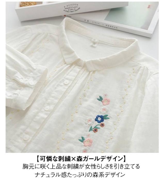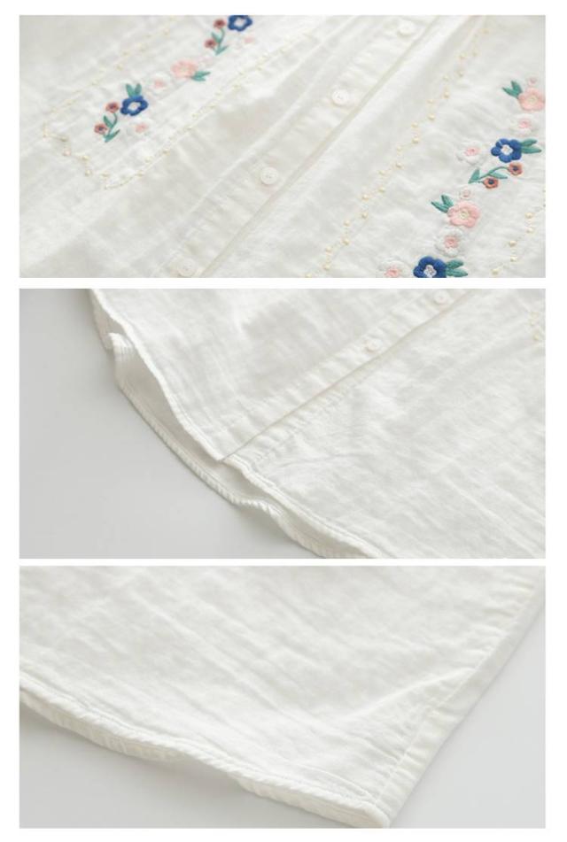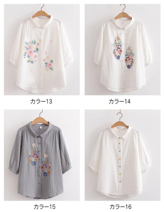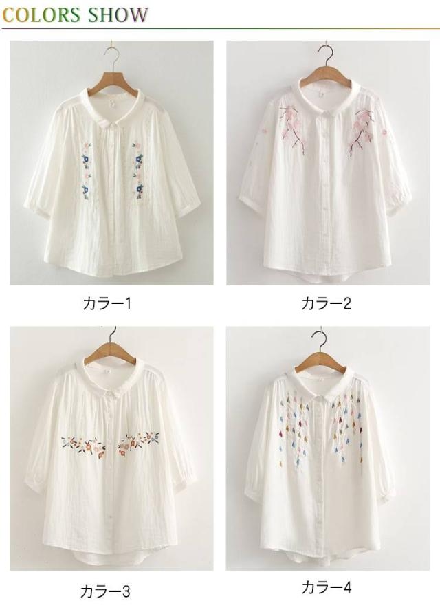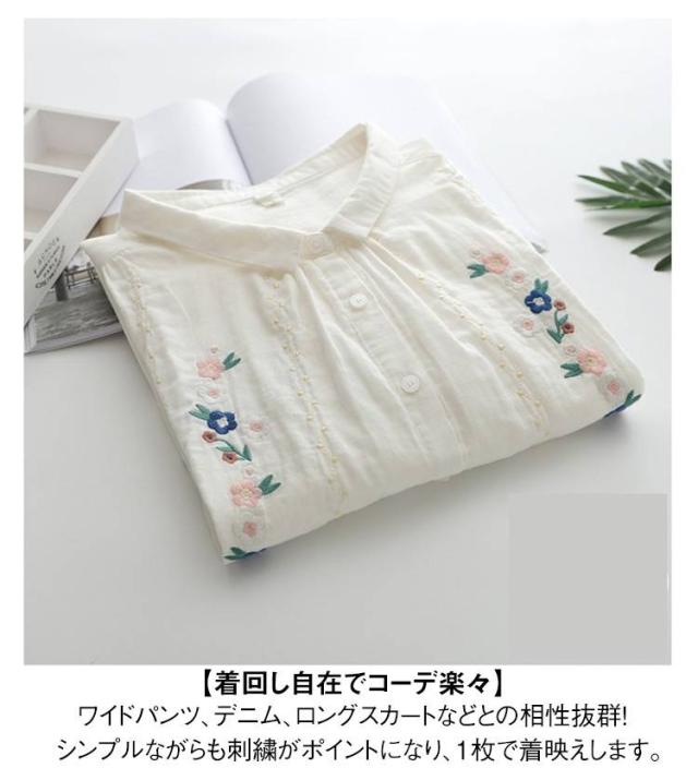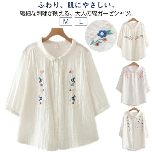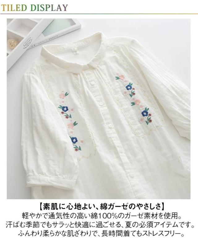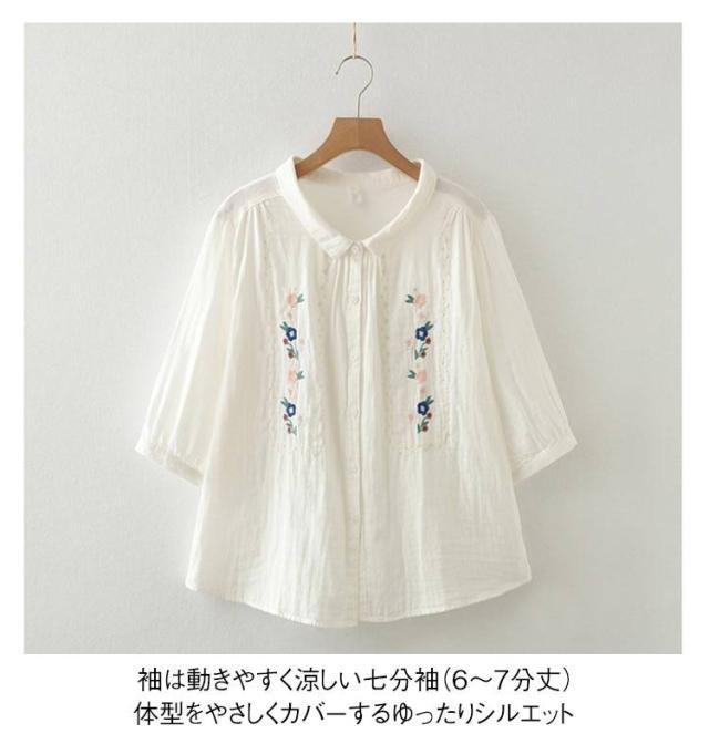 ガーゼ ゆったり 七分袖 森ガール 刺繍シャツ シャツ トップス ブラウス ブラウス ナチュラル 綿 花柄刺繍 綿シャツ 涼しい 夏 ふんわり 大人可愛い シンプル お洒落