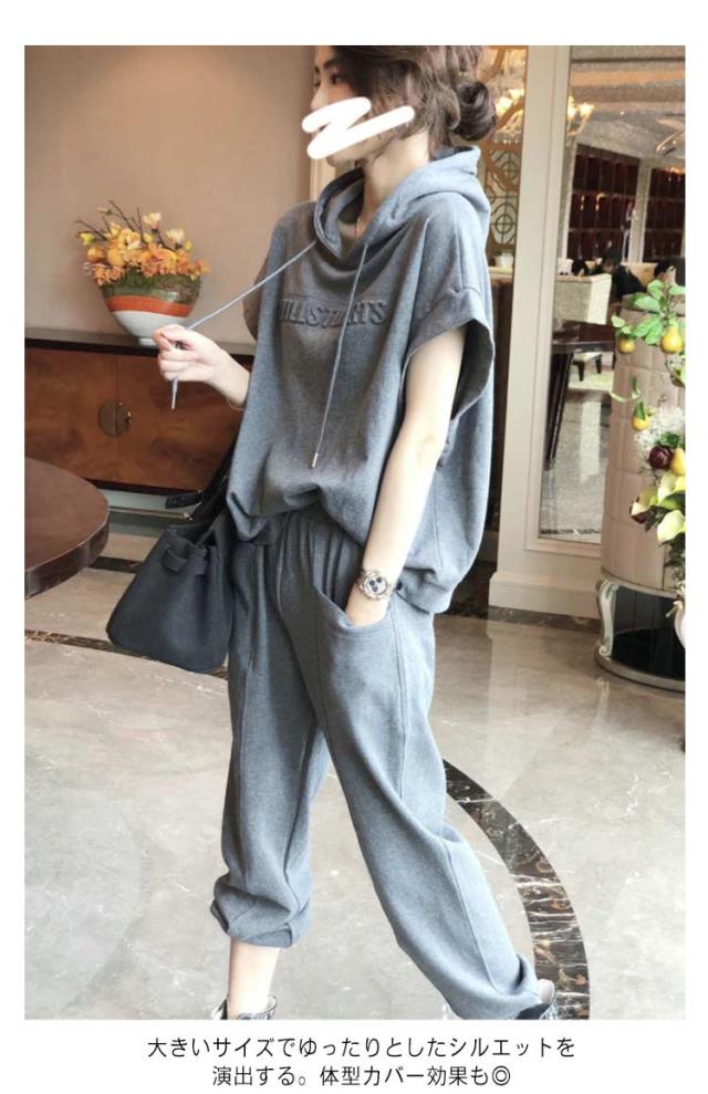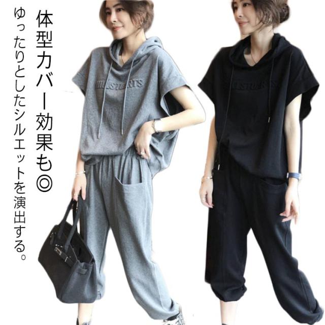 夏 スウェット フード付き 大きいサイズ 上下セット 半袖 おしゃれ レディース 7分丈パンツ ゆったり スウェットパンツ 着痩せ 無地 体型カバー カジュアルセットアップ 春秋 ジャージ シンプル カジュアルセットアップ 部屋着 運動着 スポーツ お出かけ ギフト ダンス衣装
