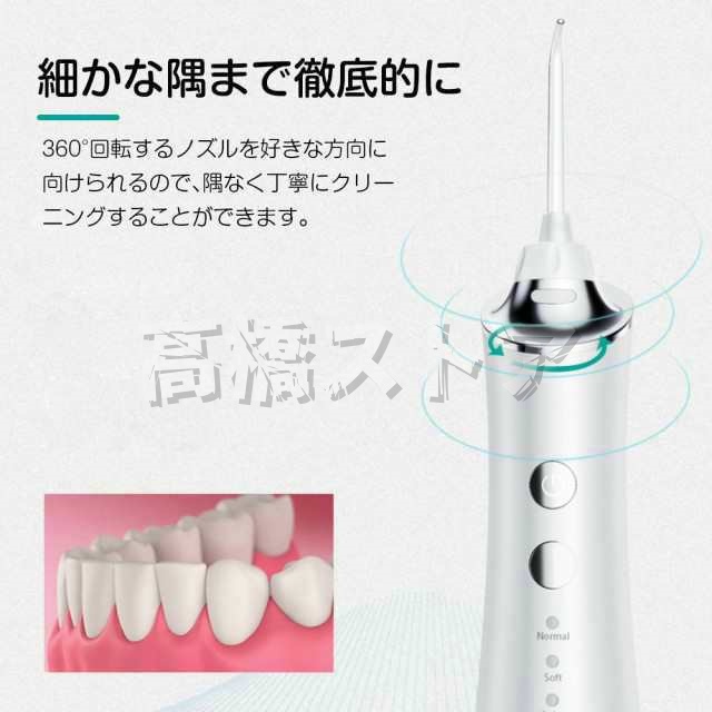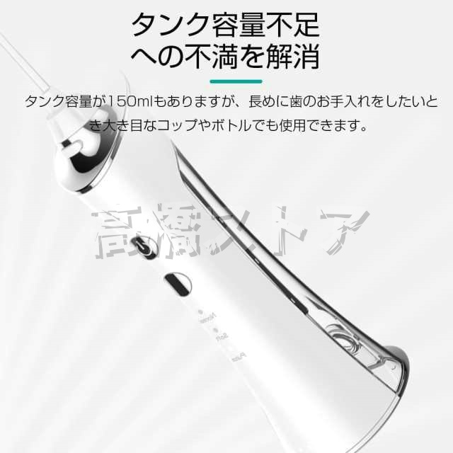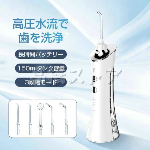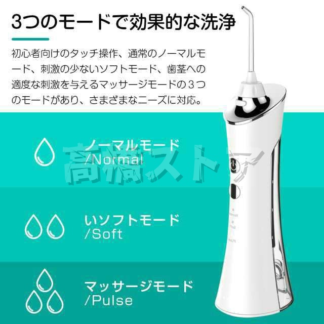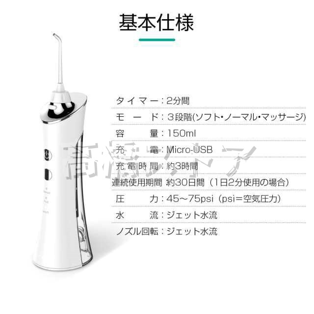 タイマー:2分間 モード:3段階(ソフト・ノーマル・マッサージ) 容量:150ml 充電:Micro-USB 充電時間:約3時間 連続使用期間:約30日間(1日2分使用の場合) 圧力:45〜75psi(psi=空気圧力) 水流:ジェット水流 ノズル回転:360度