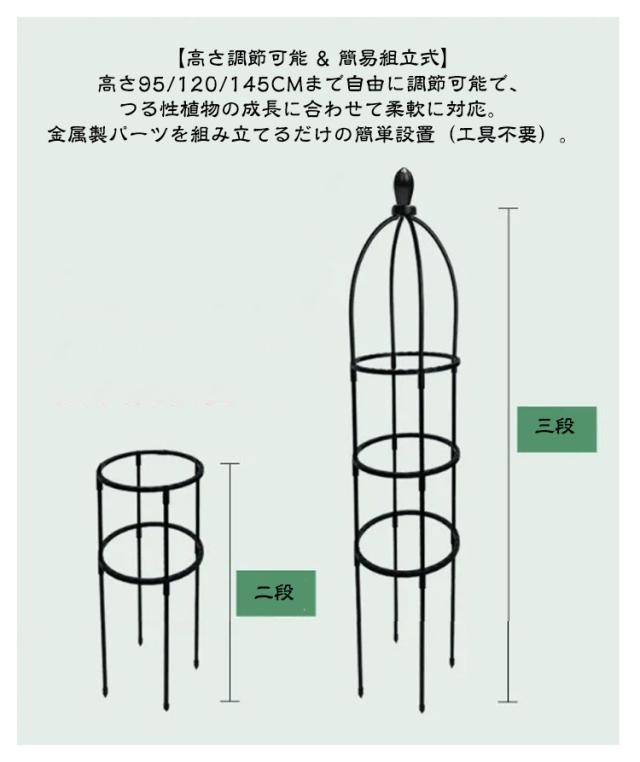 | 植物の成長を補助する。植物の葉が密集しなくなり、光合成を促進。バランスを整え、重さで茎が折れるのを防げます。 【高さ調節可能 & 簡易組立式】高さ95/120/145cmまで自由に調節可能で、つる性植物の成長に合わせて柔軟に対応。金属製パーツを組み立てるだけの簡単設置(工具不要)。 【頑丈な金属製デザイン】金属素材で耐久性抜群。スタイリッシュなオベリスクアーチ形状で、庭やプランターのアクセントに。 【つる性植物の最適サポート】バラ(薔薇)、クレマチス、朝顔など、あらゆるつる性植物の誘引に最適。植物の自然な成長を促し、倒伏を防止。 【おしゃれな園芸装飾】シンプルでモダンなデザインがガーデンやベランダの景観をアップ。鉢植えや花壇の立体感を演出。 【多用途活用】プランター周り、庭の小道、エントランスなど、さまざまな場所に設置可能。季節の花やライトを絡ませて、オリジナルの装飾アイテムとしても活用。 | |