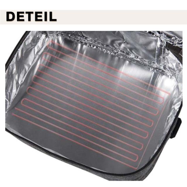 | 暖かい食べ物をいつでもどこでも楽しめるランチバッグ USB式 ランチバッグ。 バッグ内にヒーターが内蔵されています。いつでもどこでも暖かくて美味しい物を食べます。 電熱保温バッグはお弁当だけではなく、缶コーヒーなどの飲み物を入れることもできます。 外側は撥水加工したオックスフォード、内側は断熱アルミシートを採用し、汚れても濡れてもサッと拭くだけでキレイになります。 保冷剤を入れて保冷バッグとしての利用も可能です。耐磨耗や耐久性や防水性に優れます。お弁当の美味しさを保ってくれます。 USB給電式なので、面倒な手間はかからず、や車載電源のUSBポートに接続して使用できます。 | |