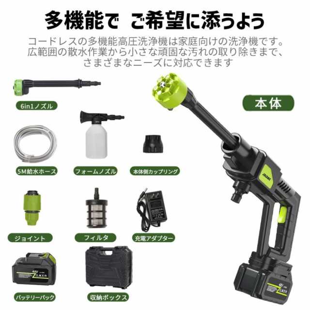 高圧洗浄機 ハンディウォッシャー コードレス 6in1 充電式 マキタバッテリー対応 収納ケース付 大容量バッテリー ポータブル 自吸式 強力噴射 洗車タオル 軽量 家庭用 電動工具 大掃除 母の日 ギフト【正規品】