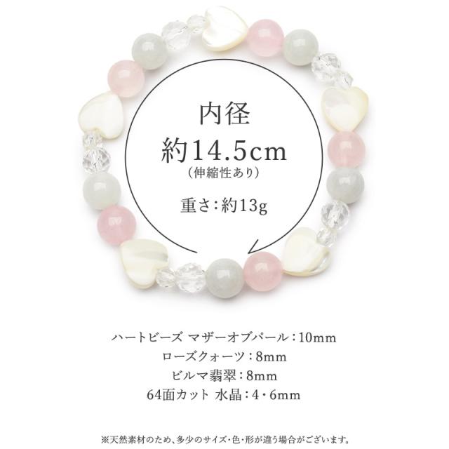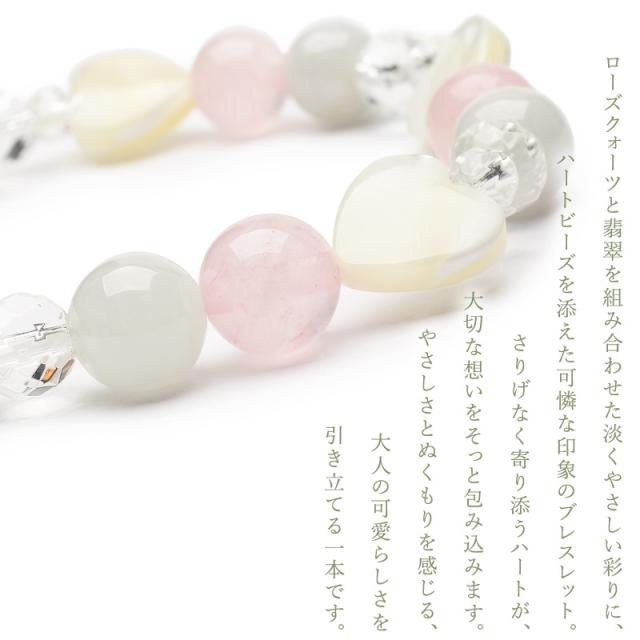 | 特徴・意味 | マダガスカル産のローズクォーツとミャンマー産のビルマ翡翠を組み合わせた淡い彩りに、母貝特有の輝きが美しいハート型のマザーオブパールが可愛らしい印象のブレスレットに仕上げました。 優しさとぬくもりを感じる大人の可愛らしさを引き立てる一本です。 ロンデル不使用で金属アレルギーがご心配の方でも安心して身につけていただけます。 本物の翡翠(硬玉ジェダイト)と呼ばれる、ミャンマー産ビルマ翡翠(硬玉ジェダイト)は最強の守護石と呼ばれ、健康運や財運を司り、持つ者に五徳(仁・智・義・礼・信)を与えると言われています。 本翡翠(硬玉ジェダイト)ならではまるで大理石のような複雑に綾を成したその姿には、地球の奥深くで、長く長く築いてきた証のようにも見えます。非常に稀少価値の高いビルマ翡翠(硬玉ジェダイト)です。 材質 ▼ マザーオブパール ハート 10mm ビルマ翡翠(硬玉ジェダイト) 8mm マダガスカル産ローズクォーツ 8mm 64面水晶 6mm 64面カット水晶 4mm |