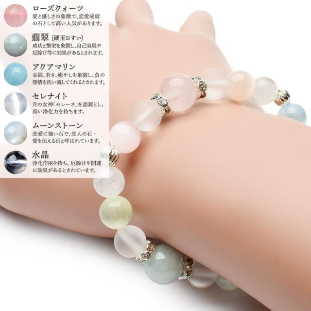 | 材質 | ムーンストーン ローズクォーツ 翡翠 アクアマリン セレナイト 水晶 産地:ブラジル他 |