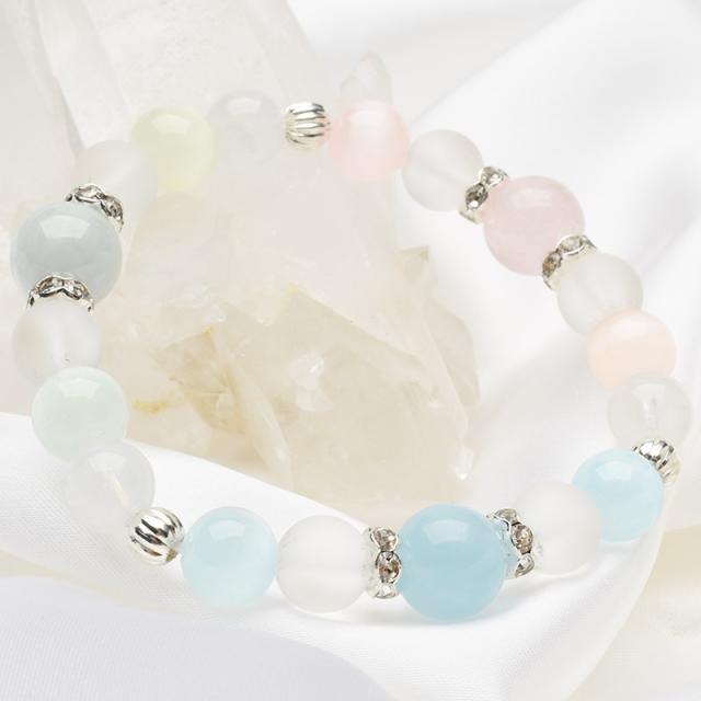 | 特徴・意味 | ローズクォーツ・アクアマリン・翡翠の3色を組み合わせた花束のような華やかなブレスレットに仕上げました。 ムーンストーンのシラーやセレナイトのキャッツアイ効果が手元に輝きと透明感を与えてくれます。 ふんわりとした優しい印象の彩りをまとう一本です。 古代エジプトの王家やローマの貴族達もアクセサリーにしたとされるアクアマリン。 その語源は、「海の水」を意味するラテン語にあたります。 名前が示すとおり、青い海のような清々しさ、平和、安寧をもたらしてくれます。特に、心が疲れた人には慰めを与え、仲違いしている恋人や夫婦には和解のきっかけを与えてくれます。 材質 ▼ ビルマ翡翠(硬玉ジェダイト) 10mm ローズクォーツ 10mm アクアマリン 10mm セレナイト(透石膏) 8mm 水晶 フロスト 8mm ムーンストーン 8mm 銀ロンデル(クリアー) 6mm ロンデル 5mm |