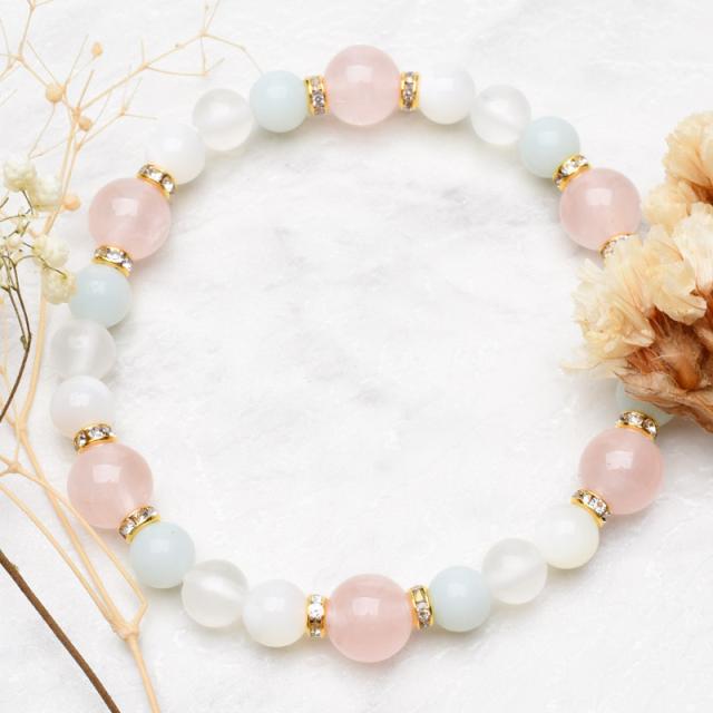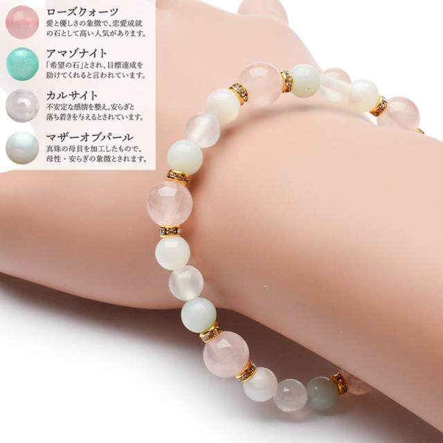 | 特徴・意味 | 人気のマダガスカル産ローズクォーツを主役にアマゾナイトやホワイトカルサイト、マザーオブパールを添えた優しい色合いのブデザインに仕上げました。 愛情と癒やしをテーマにやわらかく包み込むようなぬくもりのある配色に仕上げました。 忙しい毎日にそっと優しさを添えるブレスレットです。 ローズクォーツは愛と美の象徴の石。柔らかいエネルギーで持つ人の心の傷を癒します。更に女性ホルモンのバランスを調整し、みずみずしい美しさを保ちます。 他人や自分自身を受け入れられるような寛容な心になり、その結果、ソウルメイトを引き寄せると言われています。一度に沢山のローズクオーツを持つと異性を引き寄せ過ぎる事がありますがアメシストと一緒に持つとバランスを保てるようになります。 材質 ▼ ローズクォーツ 8mm アマゾナイト 6mm ホワイトカルサイト 6mm マザーオブパール 6mm 金ロンデル(クリアー) 4mm |