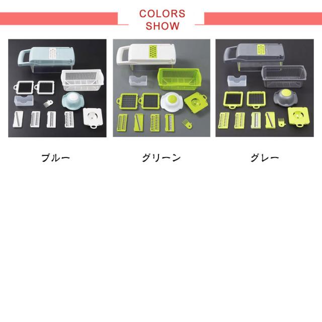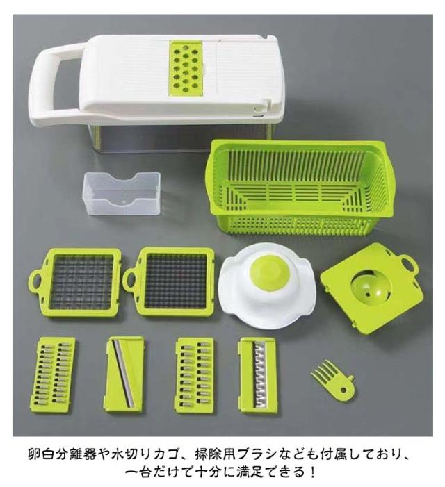 | 【一台8役!】 【多機能スライサー】 【13点セット】 1台で十分!多機能スライサー。 ステンレス製の刃のため靖びにくく耐久性に優れております。 刃は取り外し可能なので刃も本体も手軽に洗浄できます。 収納ケースが付属しており刃物を収納でき、紛失してしまう心配もありません。 ハンドルが付いているので握り心地もよく使いやすいです。 卵白分離器や水切りカゴ、掃除用ブラシなども付属しており、一台だけで十分に満足できる! | |