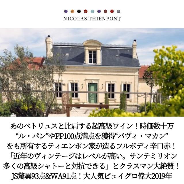 あのペトリュスと比肩する超高級ワイン!時価数十万“ル・パン”やPP100点満点を獲得“パヴィ・マカン”をも所有するティエンポン家が造るフルボディ辛口赤!「近年のヴィンテージはレベルが高い。サンテミリオン多くの高級シャトーと対抗できる」とクラスマン大絶賛!JS驚異93点&WA91点!大人気ピュイグロ偉大2019年