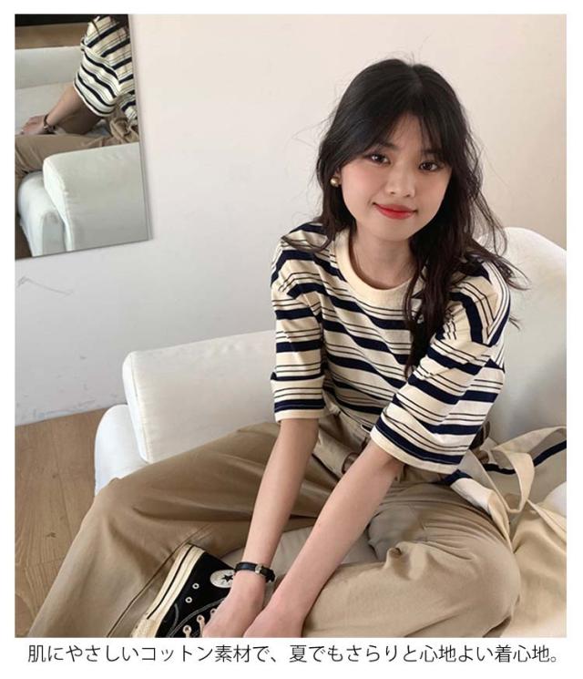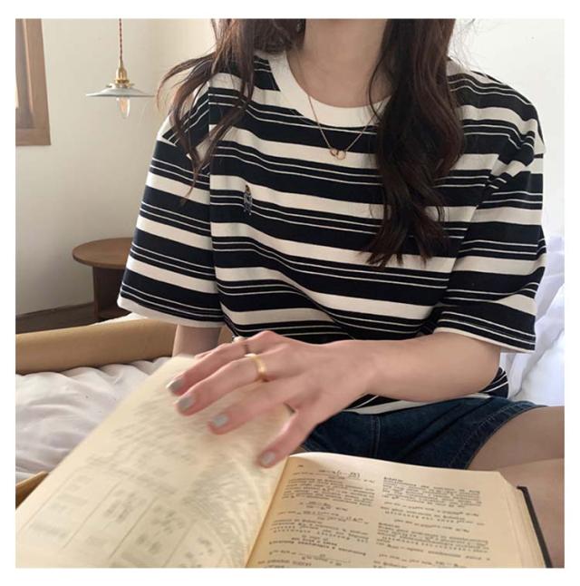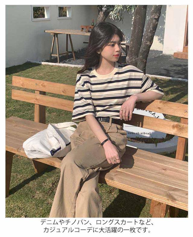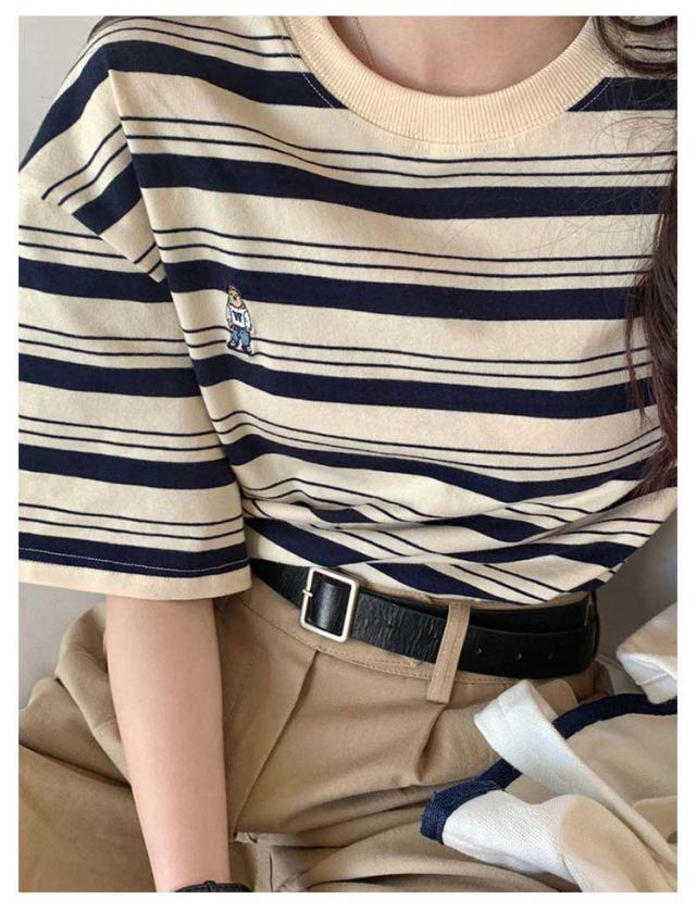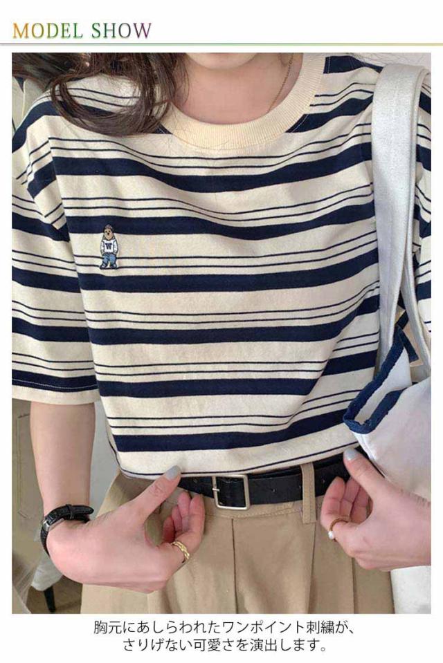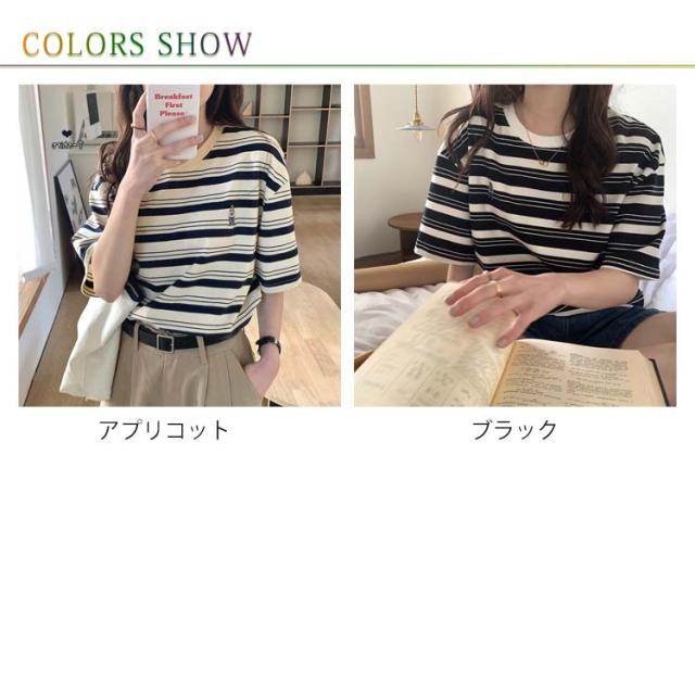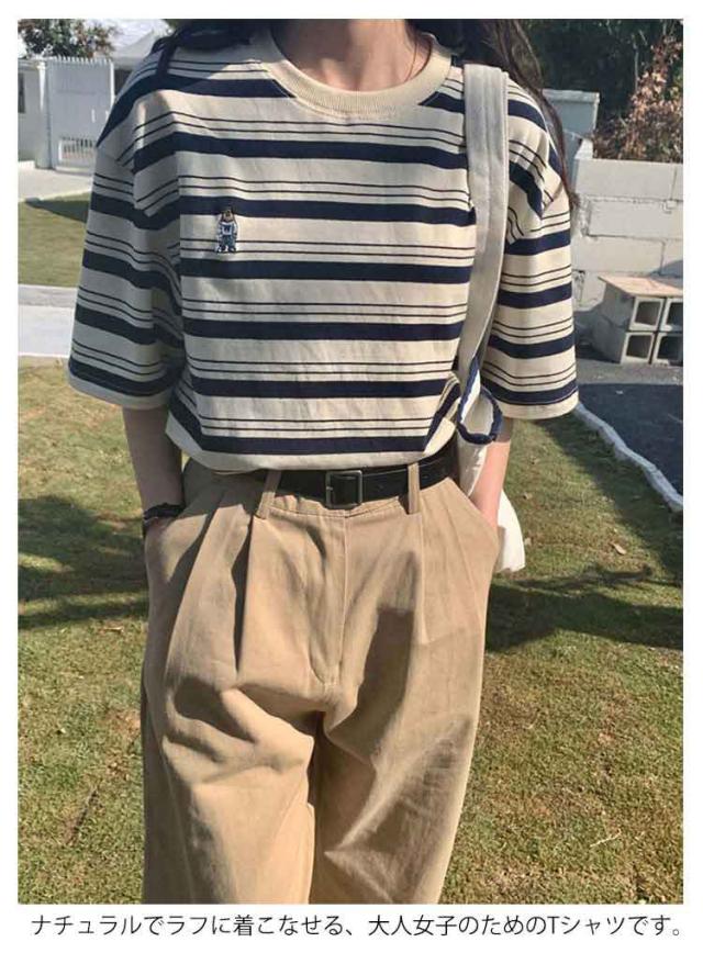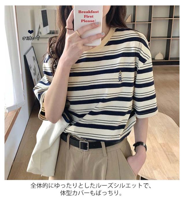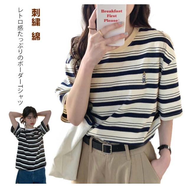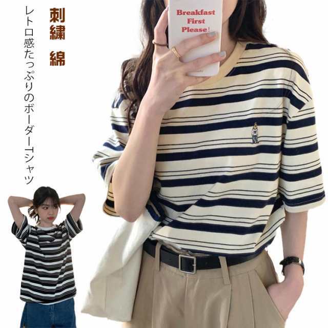 ボーダー Tシャツ レディース 半袖 tシャツ カットソー トップス ロゴ 刺繍 綿 コットン ティシャツ シンプル ゆったり レトロ カジュアル おしゃれ 大人可愛い 春 夏 夏服 アプリコット ブラック