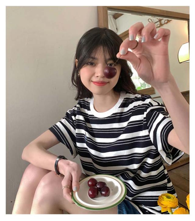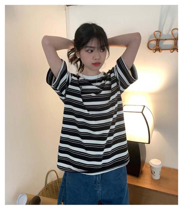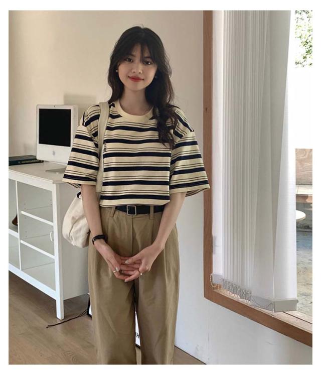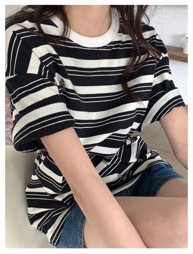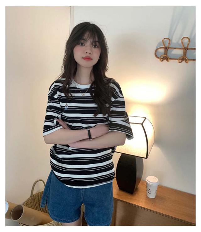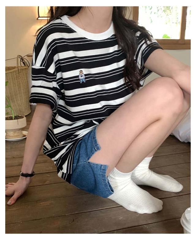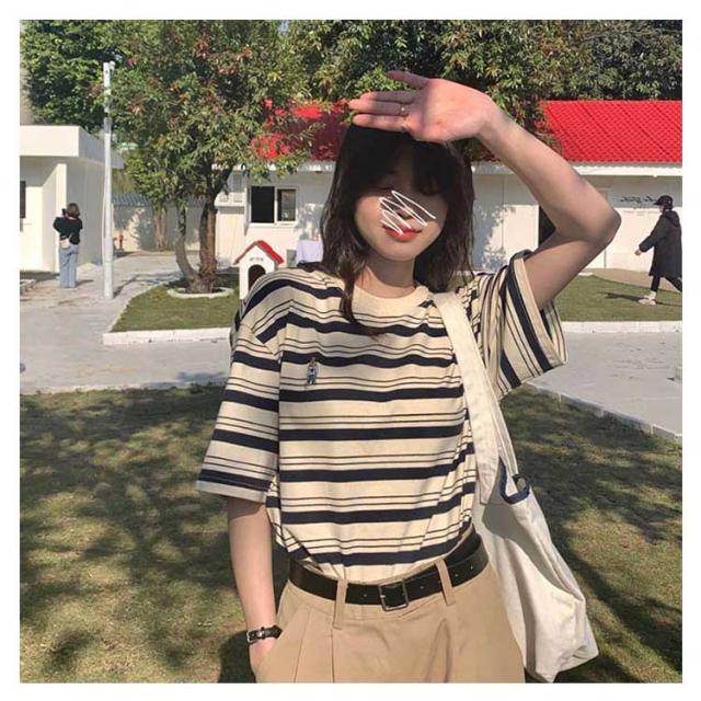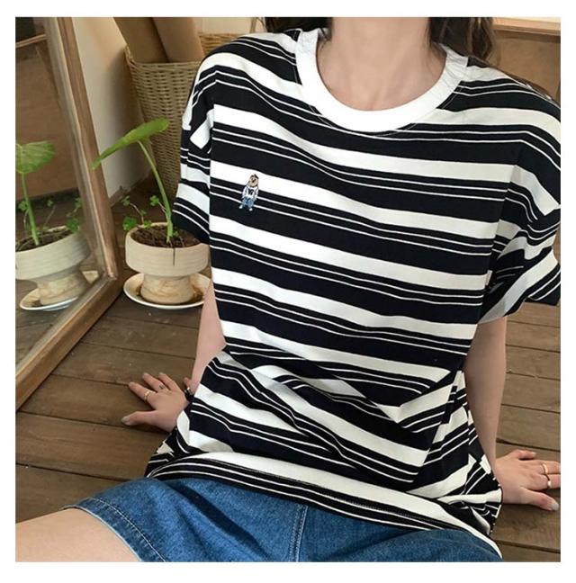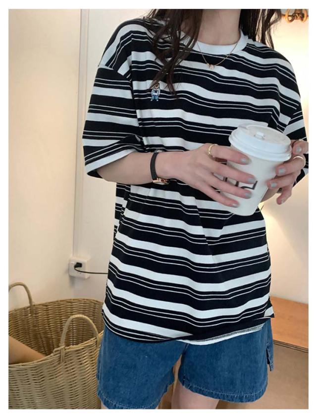 ボーダー Tシャツ レディース 半袖 tシャツ カットソー トップス ロゴ 刺繍 綿 コットン ティシャツ シンプル ゆったり レトロ カジュアル おしゃれ 大人可愛い 春 夏 夏服 アプリコット ブラック