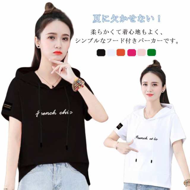 フード付きtシャツ 春 フード 半袖 パーカー Tシャツ プルオーバー tシャツ 薄手 レディース 夏 トップス フーディー プリント ロゴ パーカー カットソー テーシャツ シンプル 大きいサイズ カジュアル 送料無料