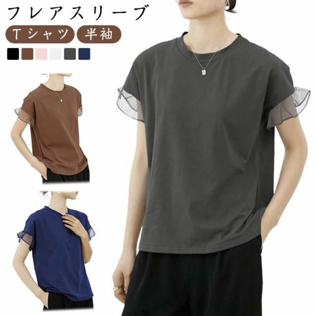 フリル袖 カットソー Tシャツ レディース フレアスリーブ トップス 半袖 フリル袖 ティアードスリーブ ティーシャツ トップス 楽ちん シンプル 春 夏 モテ 着やせ すっきり 細見え かわいい 可愛い ブラック ブラウン ピンク ホワイト ダークグレー ネイビー