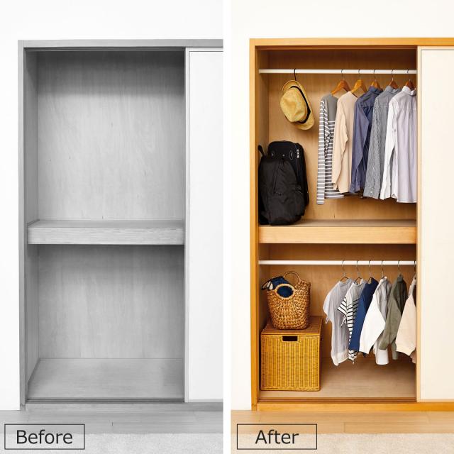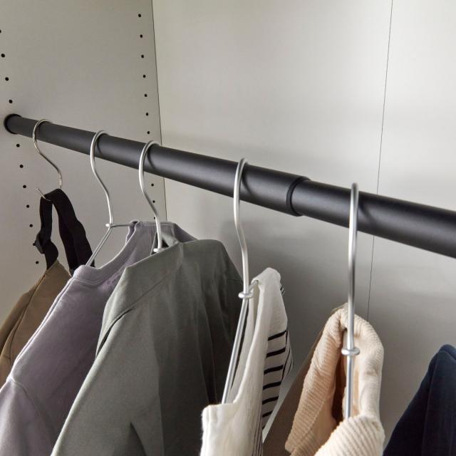 季節ごとのワードローブを掛けるハンガーポールは、荷重による落下が気になるものです。こちらはねじでしっかり固定する構造のため、設定荷重内であれば安心してご使用いただけます。