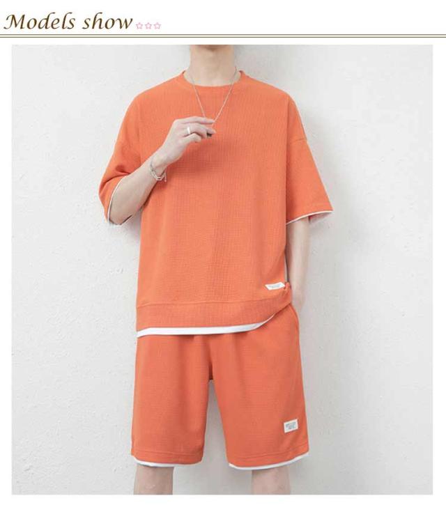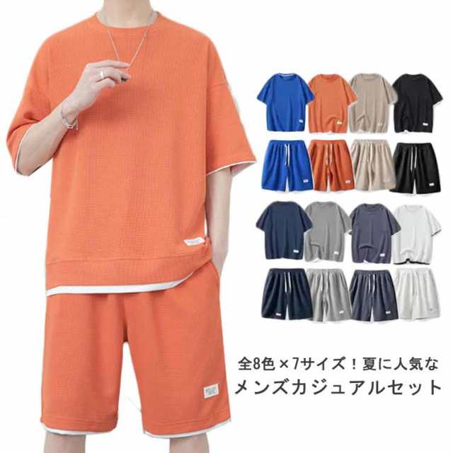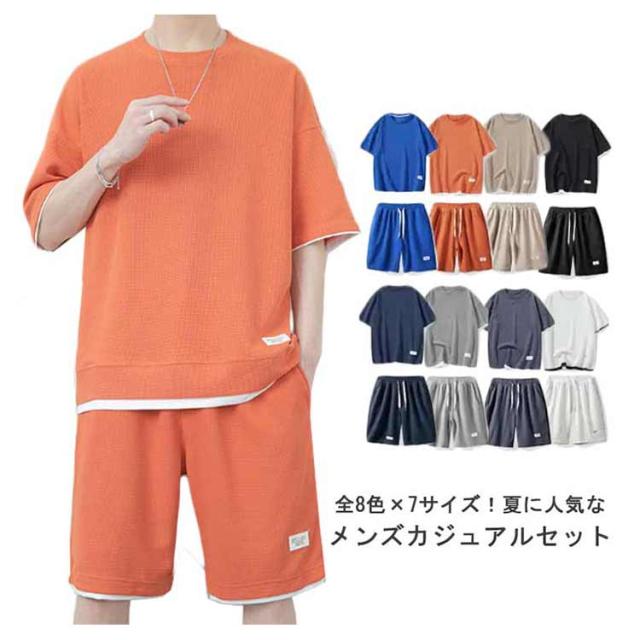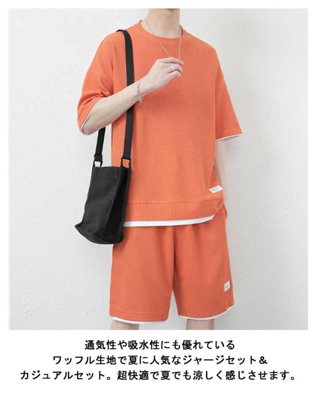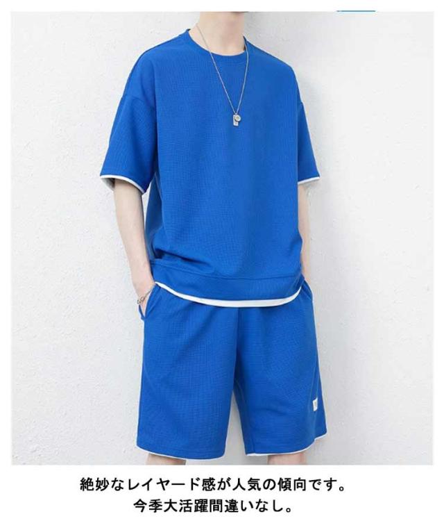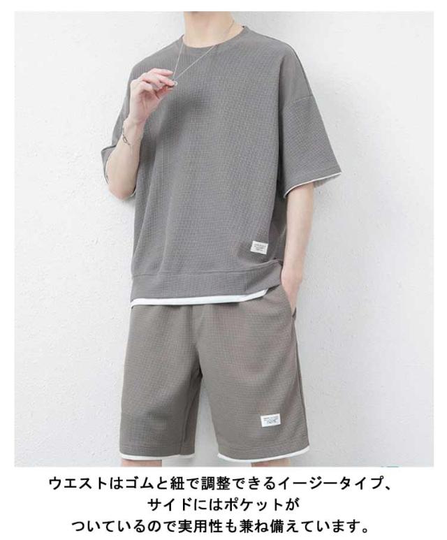セットアップ メンズ カジュアルセット ジャージ 半袖 スウェット 無地 ワッフル生地 Tシャツ 上下セット おしゃれ 夏服 ゆったり フェイクレイヤード ハーフパンツ スポーツウエア ルームウェア 部屋着 ショートパンツ 大きいサイズ 通気性 ギフト 送料無料
