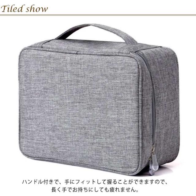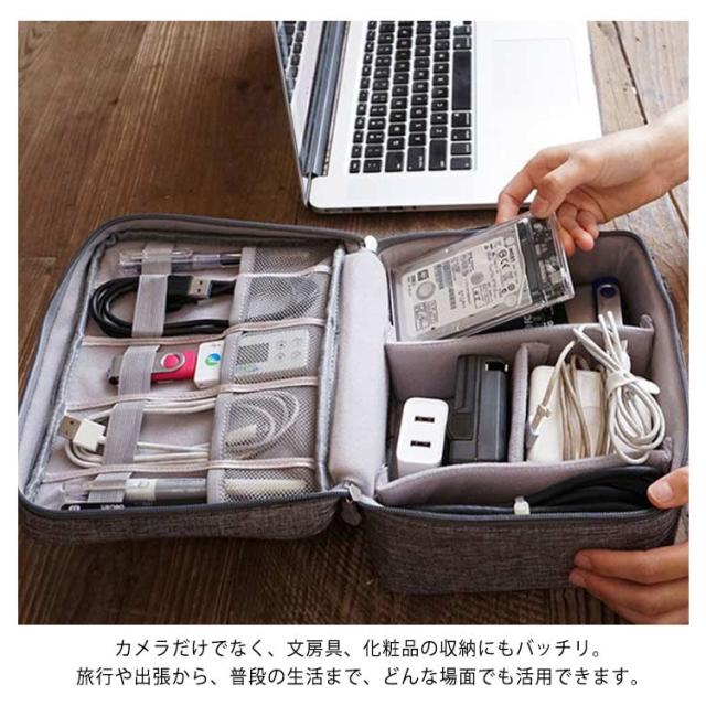 | クッション生地のフタとファスナー付きで、ホコリの侵入や重さからもガード! 肉厚のクッション生地のフタ付きなので、ホコリの侵入や上から衝撃、重さも緩和します。 仕切り板付で収納機器のサイズに合わせてバッグ内で機器が動かないように調整できます。 表面の生地に防水加工で水が不意に付いたらすぐタオルで拭くことができます。 ハンドル付きで、手にフィットして握ることができますので、長く手でお持ちにしても疲れません。 カメラだけでなく、文房具、化粧品の収納にもバッチリ。旅行や出張から、普段の生活まで、どんな場面でも活用できます。 | |