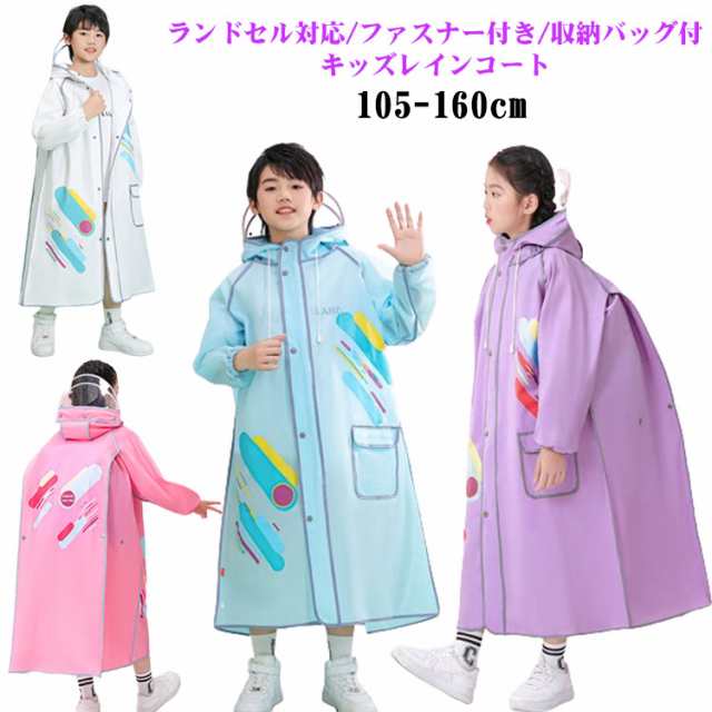レインコート キッズ ランドセル対応 防水 撥水 子供 入園入学 送料無料 女の子 男の子 かわいい おしゃれ ランドセル 雨具 幼稚園 小学生 収納バッグ付 カッパ 反射テープ ファスナー ジッパー ボタン 透明窓 105cm-160cm