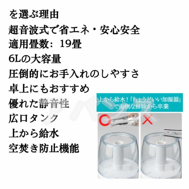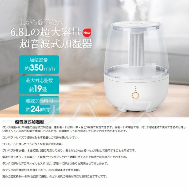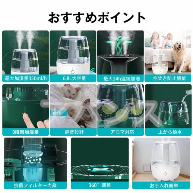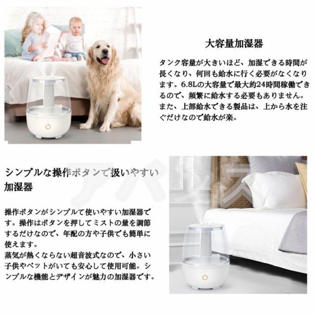 加湿器 大容量6.8L アロマ対応 抗菌 浄化 卓上 20畳 噴霧3段階調整 24時間連続運転 スチーム式 静音 おしゃれ 上部