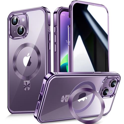 多機能隠しスタンド・Magsafe対応+覗き見防止WTAIYUN iPhone 14 用 ケース 全面保護 CDリング 縦横両対応 ワイヤレス充電 対応 米軍MIL規格 耐衝 撃 高感度タッチ 両面 いphone14 カバー スト ラップホール付き メッキTPUバンパー PC背面 透明 黄変防止 アイフォン 14 ケース 6.1イン チ(ディープパープル)