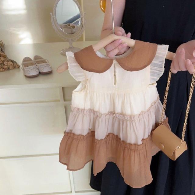 ワンピース ブラウン 切り替え柄 フリル袖 子供服 女の子 キッズ服 お出掛け 夏 新作 可愛い 新品 韓国風 1-6歳