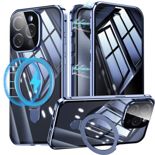 iPhone 15 Pro 用 ケース 両面 MagSafe対応 覗き見防止 アイフォン15プロ ガラスケース のぞき見 360°全面保護 Uovon スマホケース あいほん 15pro フルカバー 多機能一体スタンド カメラレンズ保護 ロック付き ・ ブルー