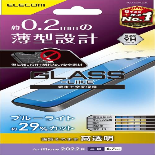 エレコム iPhone 14 Pro Max ガラスライクフィルム ブルーライトカット 薄型 0.2mm ハードコート 表面硬度9H 指紋防止 エアーレス 光沢 PM-A22DFLGLBL