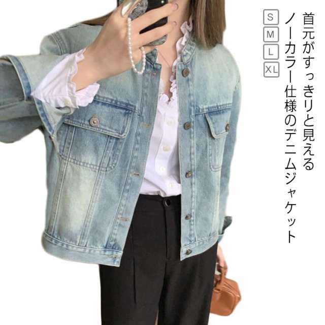 カットオフ ジージャン アウター レディース Gジャン デニム ノーカラー デニムジャケット ショート 長袖 ジャケット スリム ショート丈 ジャケット デニムジャケット 羽織 トップス ゆったり 大人 ライトアウター 韓国 ファッション アウター