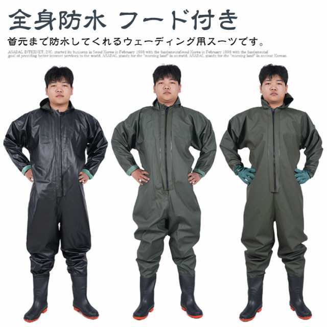 | 【全身防水】【フード付き】 ・首元まで防水してくれるウェーディング用スーツです。 ・ほぼ全身を水の浸入から守ってくれますよ。 ・このウェーダーはつなぎのように全身を覆うので動きやすく、上半身が水はねで濡れることもありません。 ・フード付きで全身をすっぽり覆ってくれる防水着なので、雨天の作業でも雨風からあなたの体をしっかりガード。 ・レインコートのように豪雨ではだけることもないので、台風などの緊急時の救護作業でも威力を発揮します。 ・素材は厚手のPVCで傷つきにくく、水の侵入はもちろん外気からも肌をしっかり守ります。 ・胸ファスナーも水の侵入を防ぐ仕様で、さらにその下にも防水布を装備。 ・靴底も滑り止めの着いた弾力素材なので履き心地もGood。 ・全体を立体成型しているので動きやすさもバッチリです。 ・漁業や農業、工事現場など様々なシーンで活躍してくれる防水着です。 | |