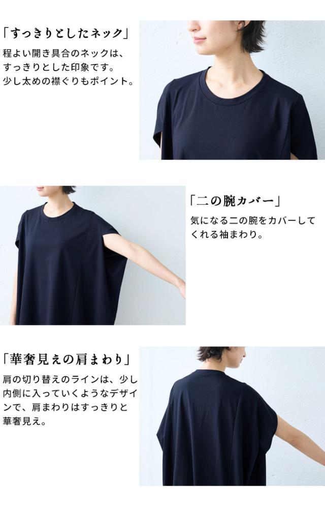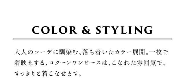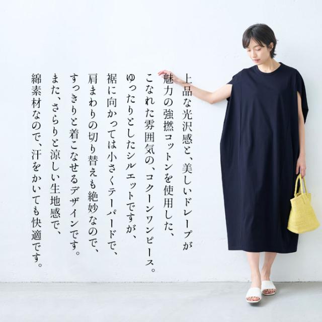 特徴 上品な光沢感と、美しいドレープが魅力の強撚コットンを使用した、こなれた雰囲気の、コクーンワンピース。ゆったりとしたシルエットですが、裾に向かっては小さくテーパードで、肩まわりの切り替えも絶妙なので、すっきりと着こなせるデザインです。また、さらりと涼しい生地感で、綿素材なので、汗をかいても快適です。