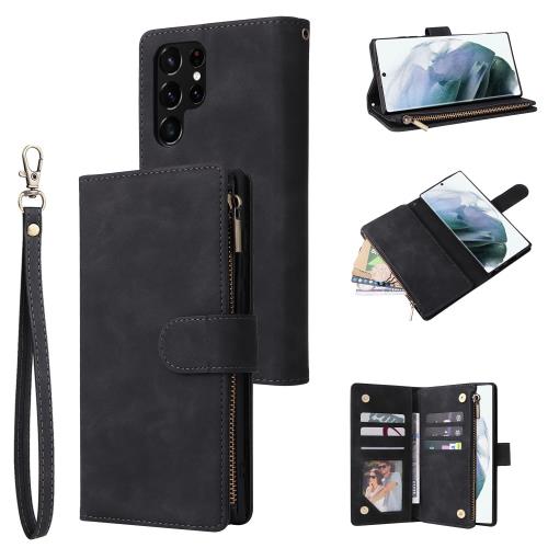 QLTYPRI Samsung Galaxy S23 Ultra 5G ケース ギャラクシーS23 Ultra 用 ケース 財布型 手帳型 レザー 6枚カード入れ 便利 実用 ファスナー 保護ケース ストラップ付き 落下防止 ベルト式 ポーチ型 軽量 耐汚れ 耐衝撃 携帯カバー - ブラック
