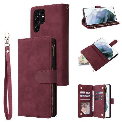 QLTYPRI Samsung Galaxy S23 Ultra 5G ケースギャラクシーS23 Ultra 用 ケース 財布型 手帳型 レザー 6枚カード入れ 便利 実用 ファスナー 保護ケース ストラップ付き 落下防止 ベルト式 ポーチ型 軽量 耐汚れ 耐衝撃 携帯カバー - ワインレッド
