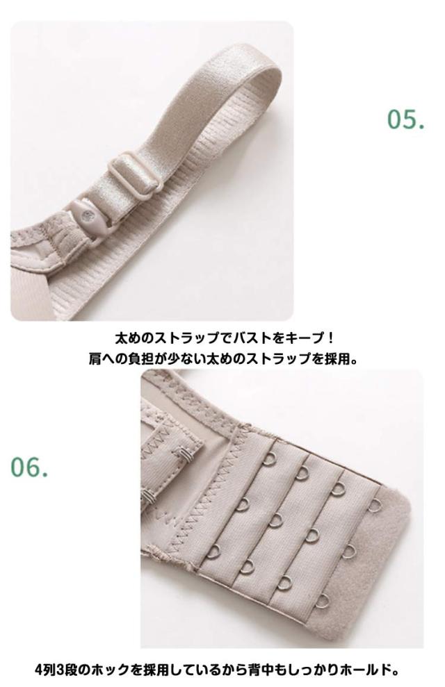| 下垂したバストもふっくら寄せる、脇高設計で脇肉スッキリのブラジャー。胸を小さく見せるブラジャー。 ノンワイヤーの仕様でストレスフリーな着用感。 伸縮性のある素材ではみ出る胸をしっかりホールド。フロント上部に伸縮性のあるゴムを入れ、視線が気になる谷間部分も高級感のあるラッセルストレッチ素材でしっかりガード。 太めのストラップでバストをキープ!肩への負担が少ない太めのストラップを採用。ストラップの付け根部分が幅広の三角形になっているので、胸のお肉が流れるのをせき止め、大きなバストをしっかり支えます。4列3段のホックを採用しているから背中もしっかりホールド。 | |