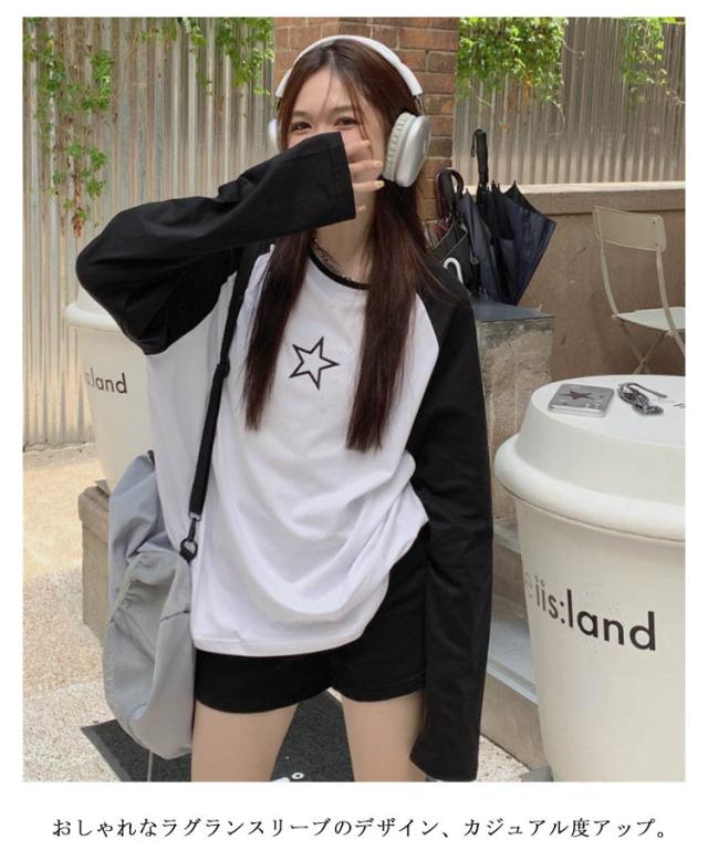 ラグランTシャツ Tシャツ ラグラン 体型カバー 長袖 かわいい ファッション レディース ゆったり 大きいサイズ 長袖tシャツ 星柄 おしゃれ ロンT カジュアル ラウンドネック ラグランTシャツ インナー 重ね着 可愛い