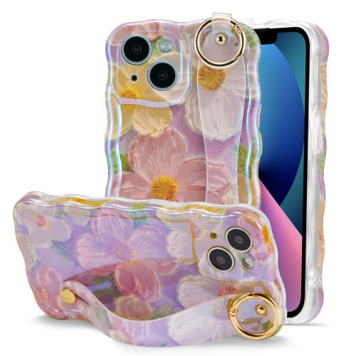 QLTYPRI iPhone 14 用 ケース TPUカバー ウェーブ おしゃれ 韓国 可愛い 花柄 薄型 軽量 耐衝撃 スマホケース ハンドベルト付き カラビナリング付き スタンド機能 ワイヤレス充電対応 ストラップホール付き アイフォン14 ケース 6.1インチ 対応 - ピンク